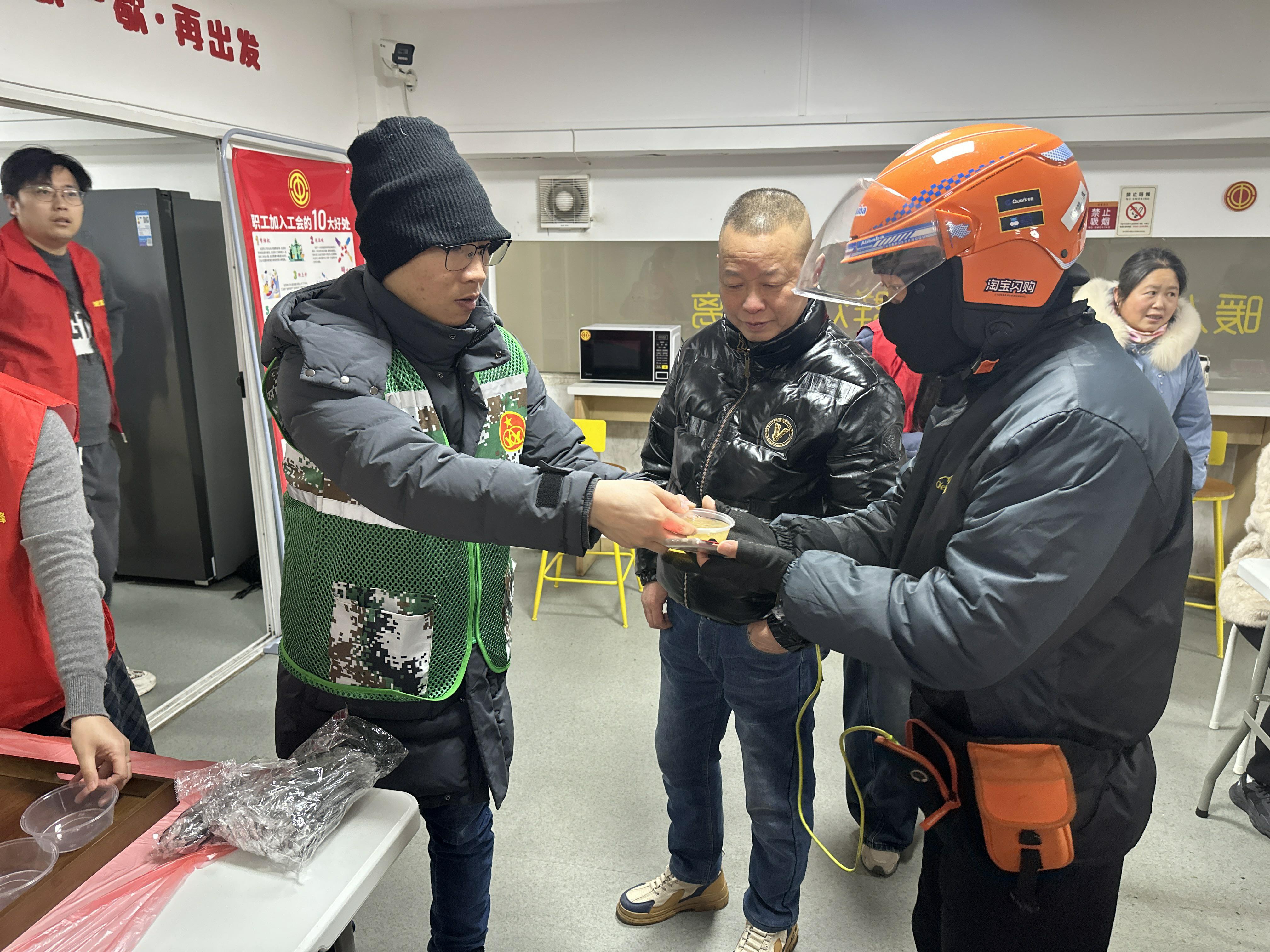 1月27日上午,嘉兴市秀洲区新城街道春晓社区摩尔驿站里十分热闹。社区退役军人志愿服务队的队员们身穿统一马甲,准备了热银耳汤、水饺等食物,开展“戎耀暖冬,情系户外劳动者”活动,为在寒冷天气中忙碌的外卖员、保洁员、快递员等户外工作者送上温暖和新春祝福。