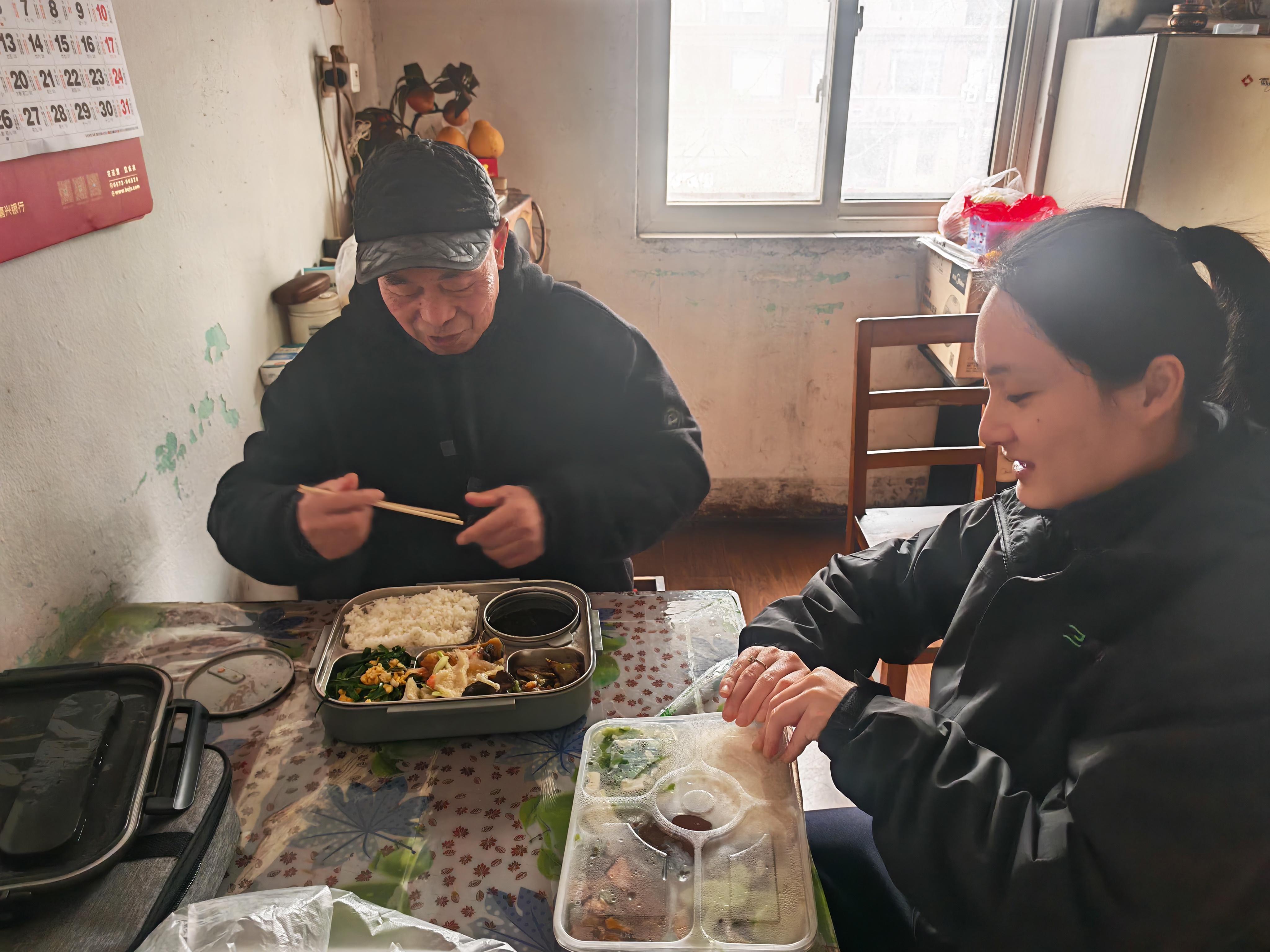 中午,社区工作人员带着爱心餐饮店精心准备的午餐,陆续走进几位高龄独居老人的家中。陪餐过程中,干部们与老人亲切交谈,细心询问他们的身体状况和生活需求,叮嘱老人注意冬季防寒保暖和用电用火安全。一顿简单的午饭,因为有了陪伴与关怀,变得格外温馨。