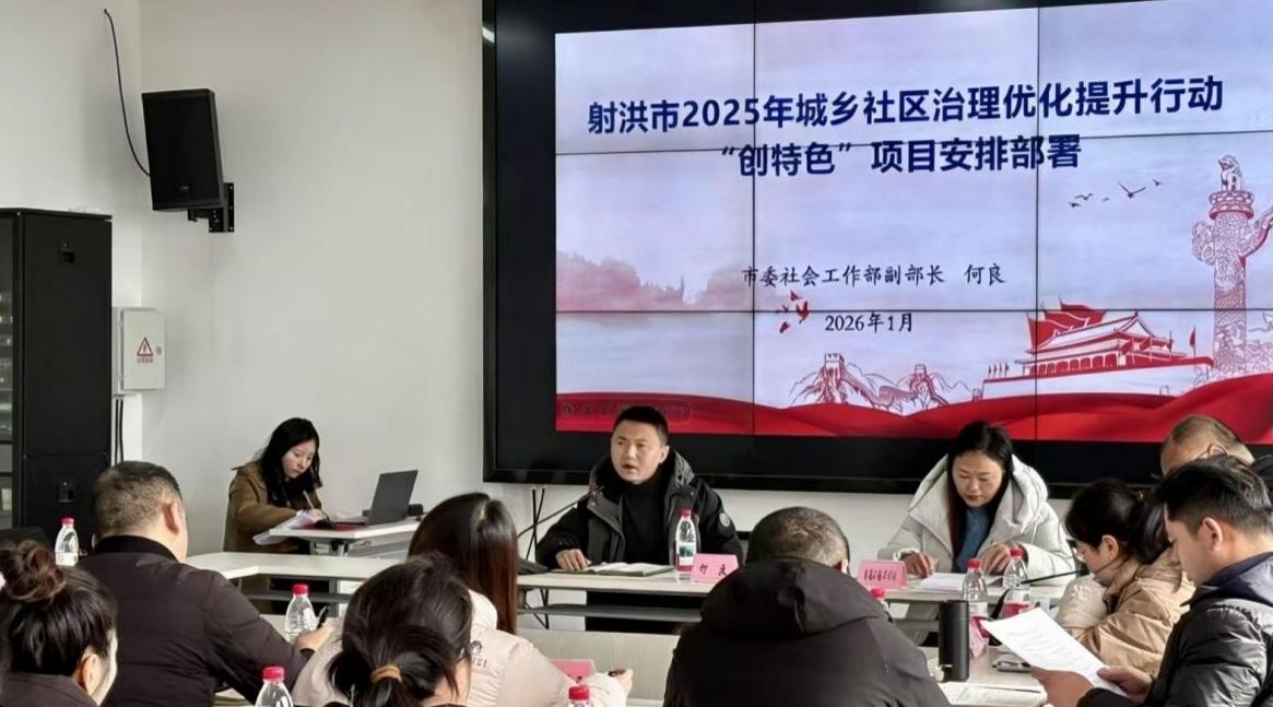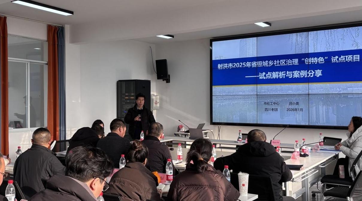 社区文化网(苏勤 谢涵)2026年1月27日下午,射洪市2025年城乡社区治理优化提升行动“创特色”项目启动暨主题培训与月度例会在市社会工作总站召开。市委社会工作部分管领导、相关镇(街道)分管领导、试点社区党组织书记、项目服务机构负责人及督导机构工作人员参会。