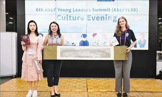 在日本大阪举行的第六届ASEF亚欧青年领袖峰会上,王誉蓉(左一)带着作品出席活动。 受访者供图