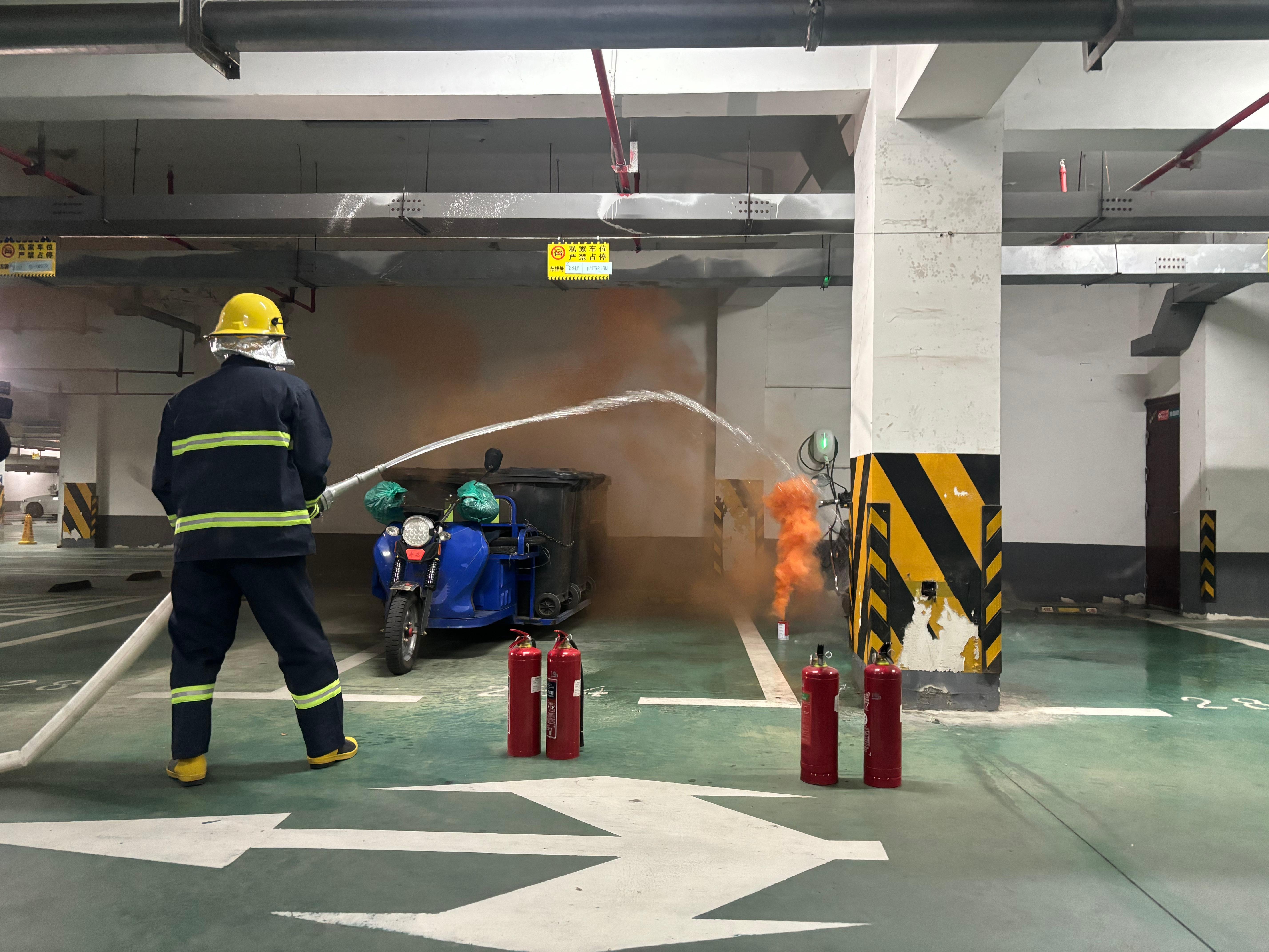 演练从发现火情的基本功练起。参演人员模拟小区日常巡检时发现火情,第一时间报警并迅速组织疏散,确保生命通道畅通。微型消防站人员快速规范穿戴防护装备,随后携带灭火器赶赴现场。在地下车库火情点,参演团队演练了消防水带的快速铺设、连接与射水操作,突出团队协作在初期火灾扑救中的关键作用,进一步巩固物业人员在火灾初起阶段的实战技能。
