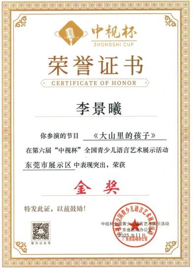 2025年年末,李景曦在第六届“中视杯”全国青少年儿语言艺术展示活动中,其朗诵的作品《大山里的孩子》,通过市赛(2025年11月29日在东莞市玉兰演播厅举行,荣获少儿A组金奖)。