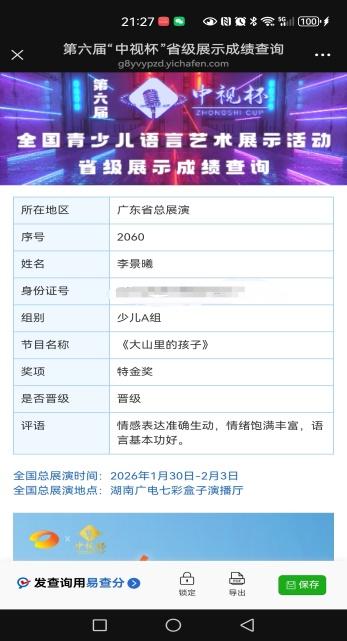 真正让李景曦声名鹊起,是第六届“中视杯”全国赛事。这场覆盖全国30余个省市、超10万名选手参与的权威赛事中,李景曦以《大山里的孩子》为作品,从东莞玉兰大剧院的市赛,到广州白云国际会议中心的省赛,再到湖南长沙七彩盒子演播厅的全国总展演,一路过关斩将。备赛中,他展现出超越年龄的专注与自律,反复研读作品、打磨细节,主动查阅留守儿童故事、与乡村孩子交流,精准把握作品情感,跨省备赛时,自录视频优化技巧,向老师虚心求教。母亲陈永美全程相伴,承担后勤、暖心鼓励,成为他逐梦路上的温暖支撑。最终,他以共情力十足的演绎、沉稳的舞台掌控力征服评委,拿下三金,评委盛赞其“以纯粹初心打通作品与观众的隔阂,是语言艺术最珍贵的底色”。