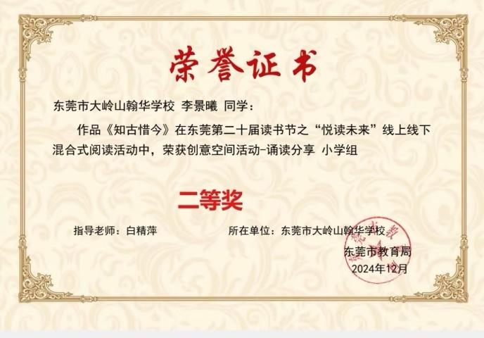 李景曦的艺术天赋自幼显现,对语言艺术尤为敏感,幼儿园时期便主动参与各类语言活动,打下扎实基础。2024年11月,他首次登上市级舞台,参加东莞市第二十届读书节比赛,凭借《知古惜今》斩获诵读分享小学组二等奖。