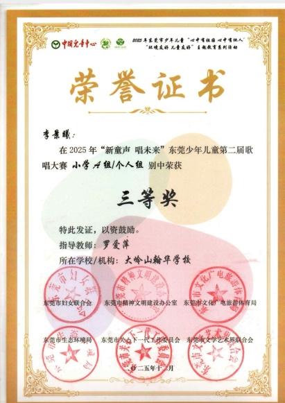 2025年1月,李景曦领唱的大合唱歌曲《歌声与微笑》在“文脉相连.艺汇香江”2025香港国际青少年文化艺术盛典活动中,荣获学前组“金奖”。
