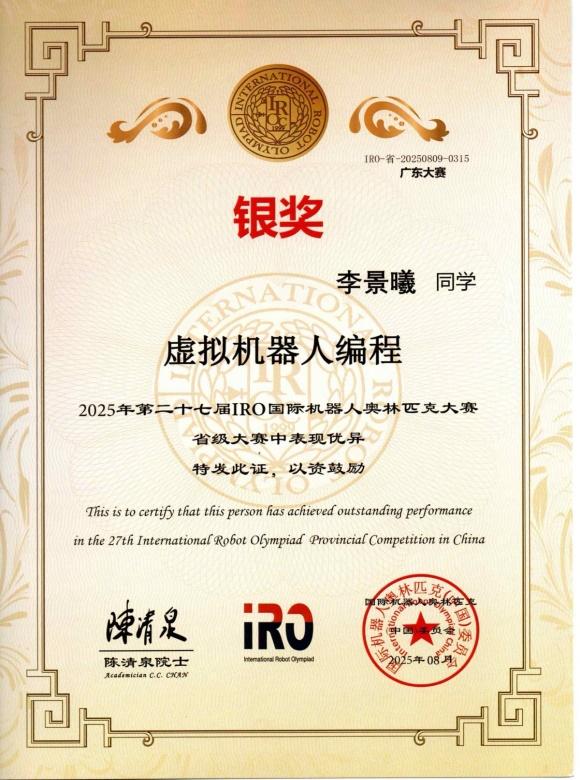 2025年8月,李景曦在广东佛山举行的2025年第二十七届IRO国际机器人奥林匹克大赛省级大赛中与搭档一起荣获“虚拟机器人编程团体“银奖”。