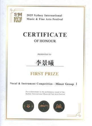 2025年11月,李景曦在东莞市举行的悉尼国际音乐艺术节广东选拔赛比赛中,荣获少儿A组“一等奖”。