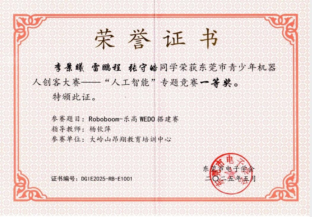 2025年4月,李景曦和伙伴们在东莞市青少年机器人创客大赛——“人工智能”专题竞赛中,荣获团体“一等奖”。