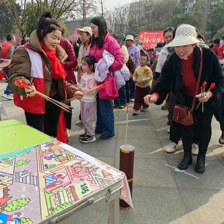 总结先进与趣味游园并举,深化治理认同感,活动现场对年度优秀网格员、志愿者及爱心企业辛勤付出表示了感谢。现场巧妙融合积分元素,设置了“趣味游园”与“积分大富翁”环节,居民通过参与“投壶”、“春联滚球”、“安全标识拼拼看”等趣味任务获取积分、兑换礼品,在游玩中深化了对社区积分制度的理解与认同。主题打卡点与幸运大转盘抽奖更是增添了无限乐趣。