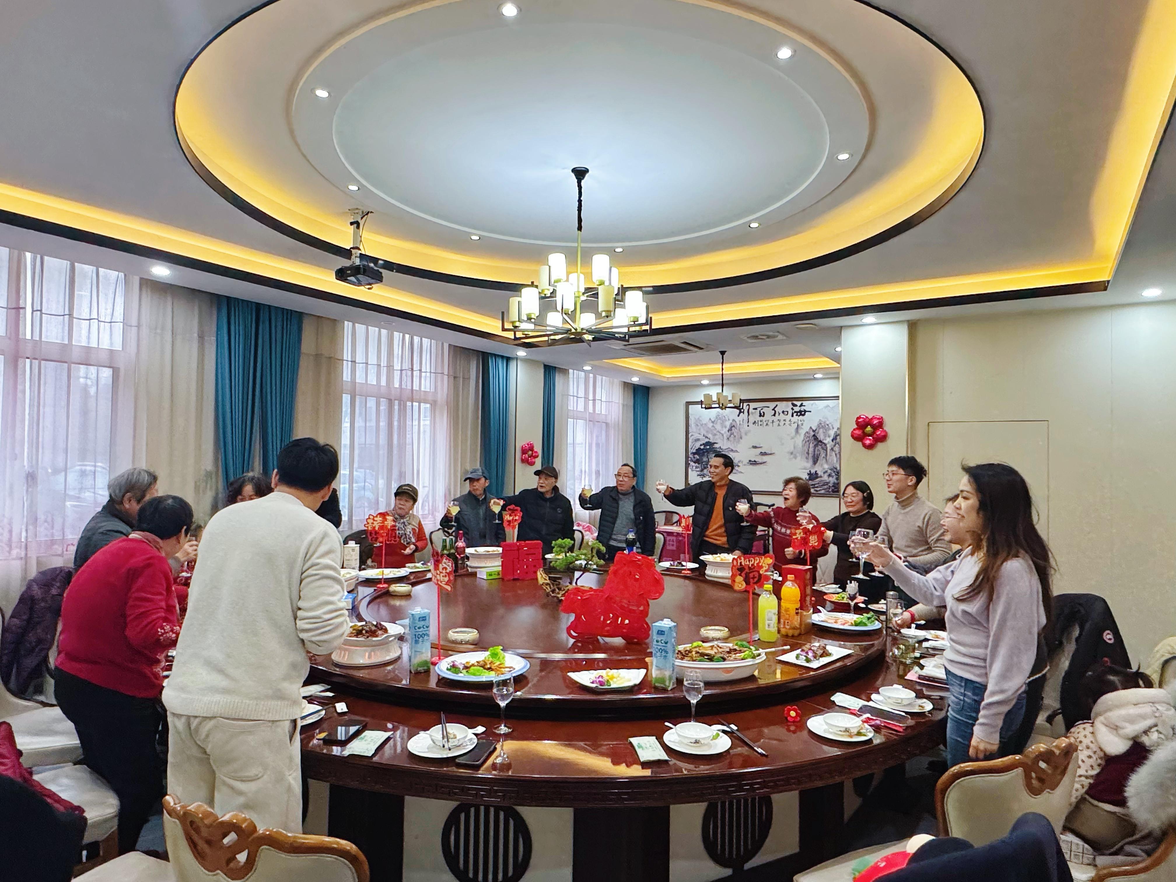 开餐仪式上,社区党总支书记陆蔚温情致辞,众人携手切开点缀着小红花束的新春蛋糕,团圆家宴也正式开席,老人们相偕围坐,举杯互道新春祝福。