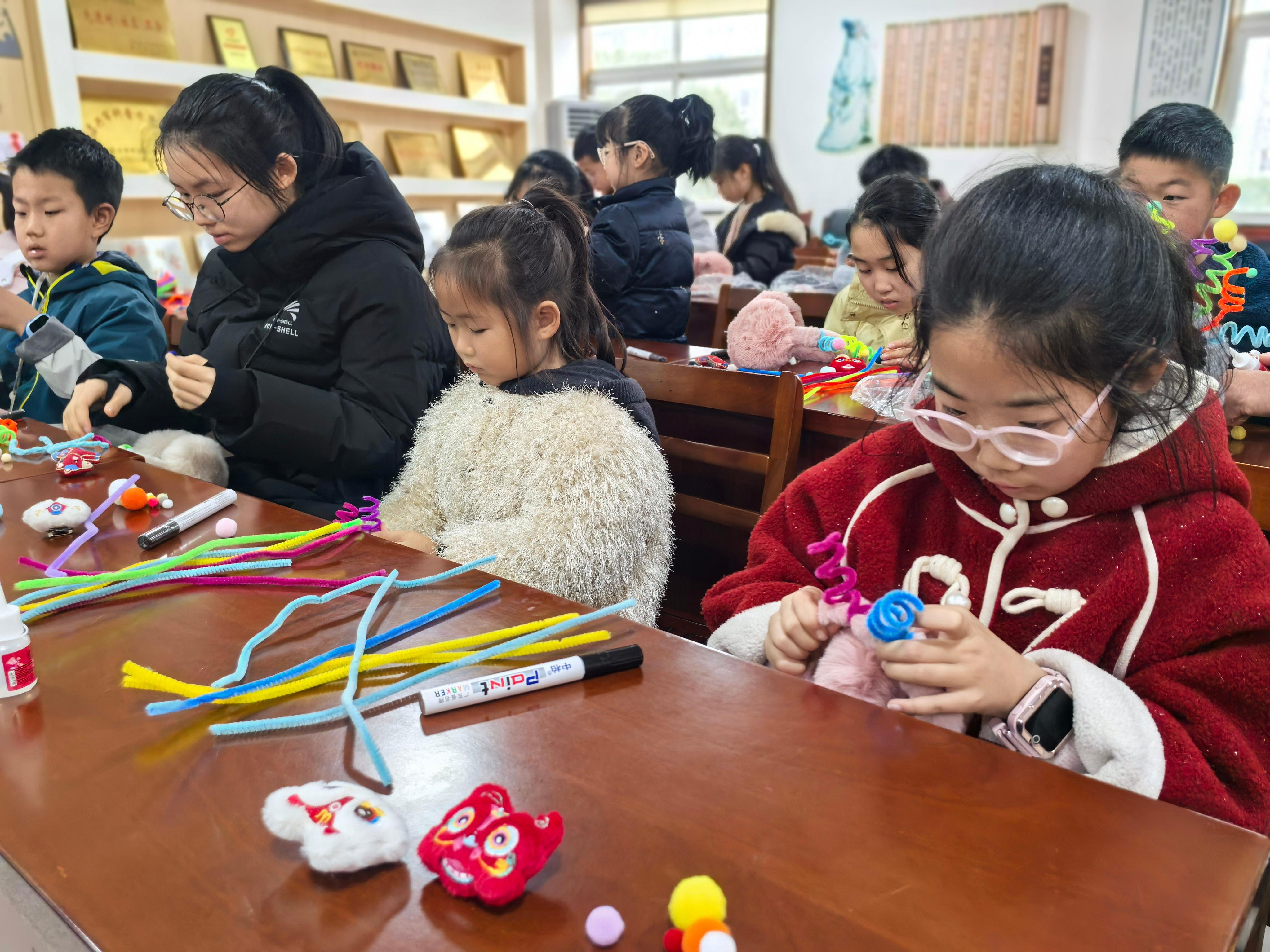 活动在茶香坊社区活动中心展开,我们通过“年俗故事会”把春节从典故里请出来,让它变成可触摸、可创作、可欢笑的真实体验。孩子们在了解春节习俗的由来后,便投入到“马年福气耳罩”的制作中。在指导老师的带领下,亲手裁剪、拼贴、装饰,将一抹红色与马年元素融入耳罩设计之中。这一环节不仅锻炼了孩子们的动手能力与审美创造,也呼应了未来社区重视“美育”与“劳动实践”的育人场景,让新春祝福化为可佩戴的温暖纪念。