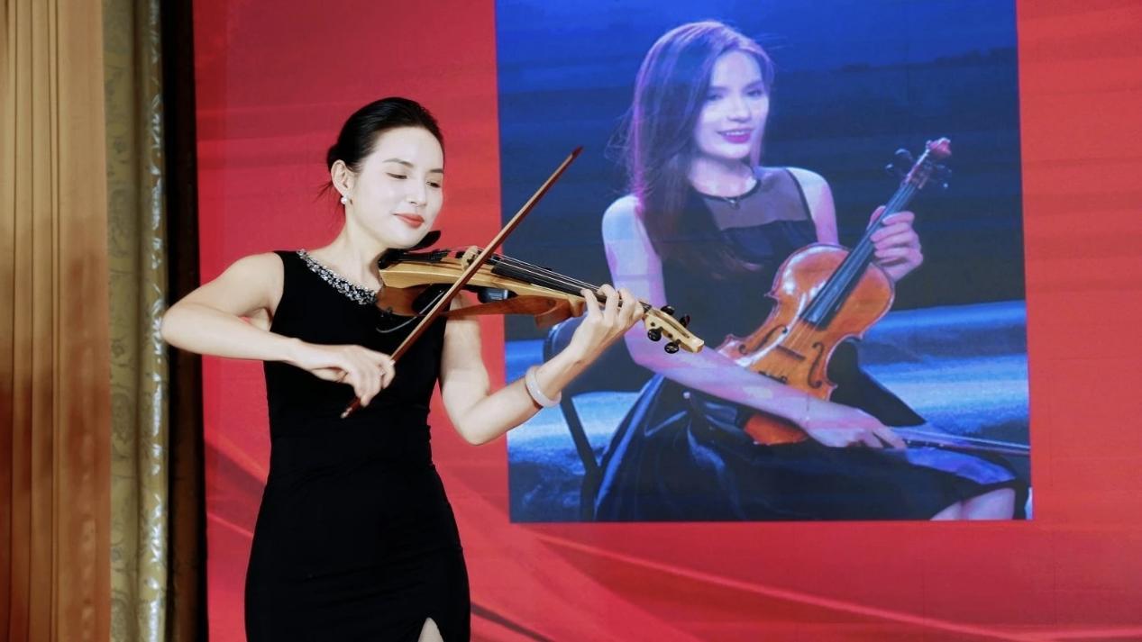 在活动中,湖北交响乐团小提琴家黄霖演奏《胜利》《激情节奏》,琴声婉转悠扬;歌唱演员杨红的《好儿好女好江山》《我们的新时代》唱响新时代、致敬新征程。为感谢艺术家的精彩演绎与支持,应邀参会的武汉襄阳商会袁道胜会长代表武汉地级市联盟商会为杨红老师授牌,希望延续友好往来,助力商会持续传递好声音、正能量。