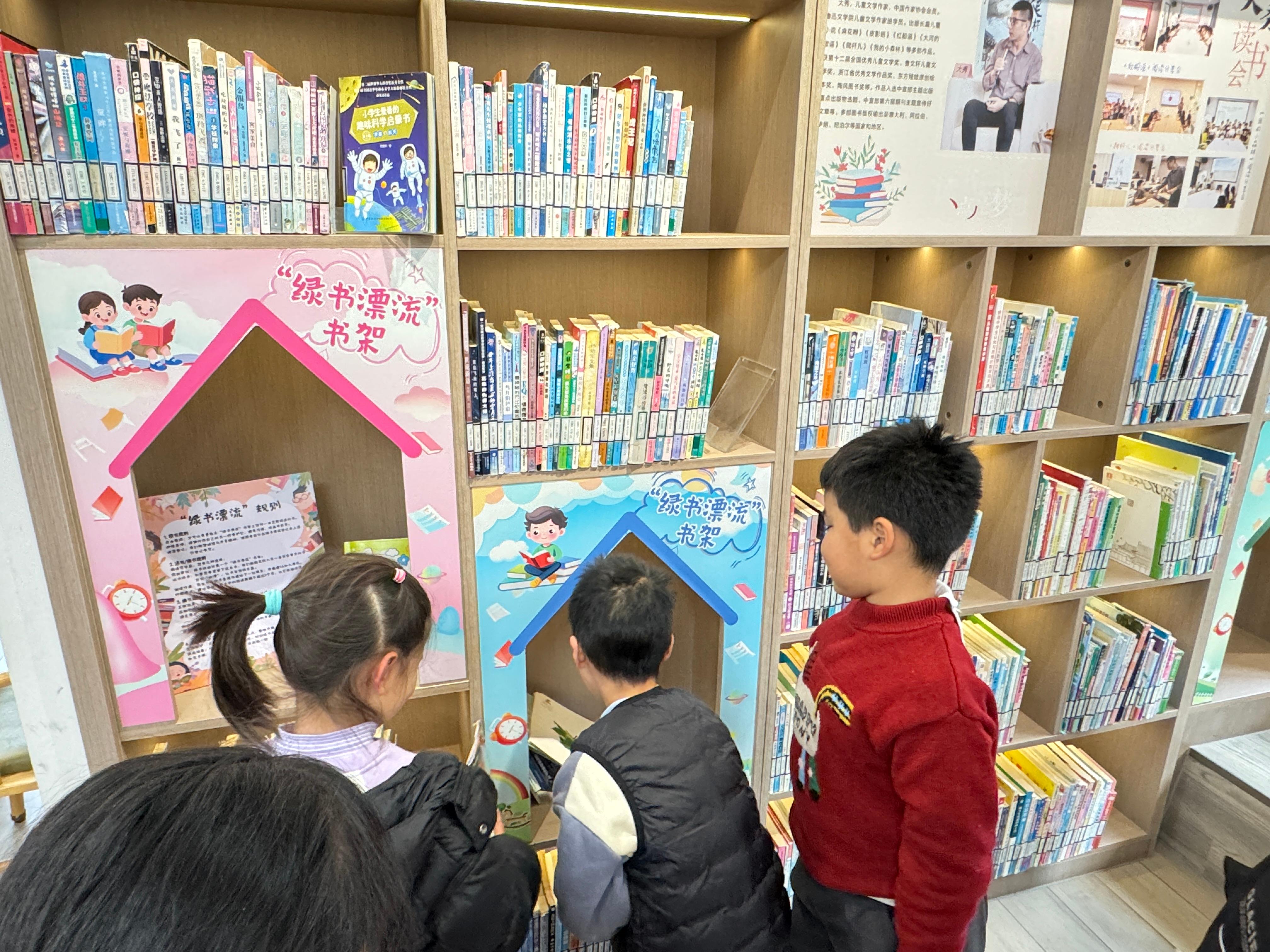 随后,“大秀老师”与孩子们一同将首批精心准备的“漂流书籍”放入智慧书房内专设的“绿书漂流”书架。随着书籍的落架,“绿书漂流”活动正式宣告启动。孩子们随即在书架上挑选自己感兴趣的图书,或现场沉浸阅读,或完成首次借阅登记,率先体验了图书“漂流”的新奇与乐趣。