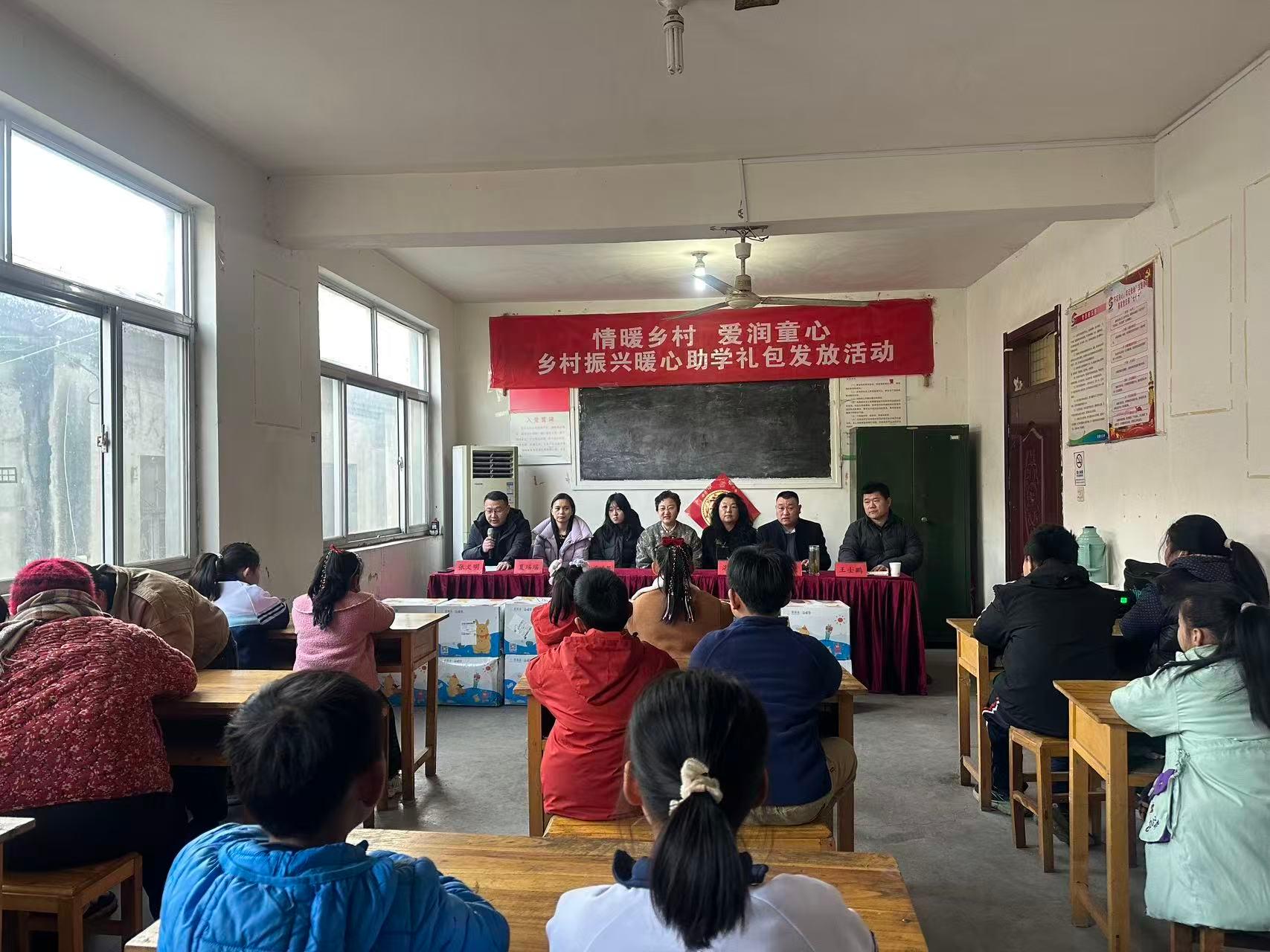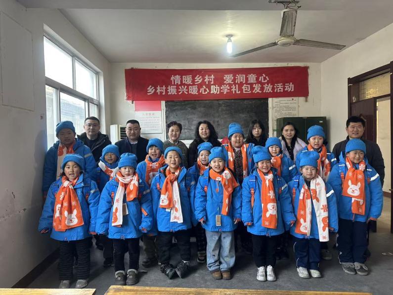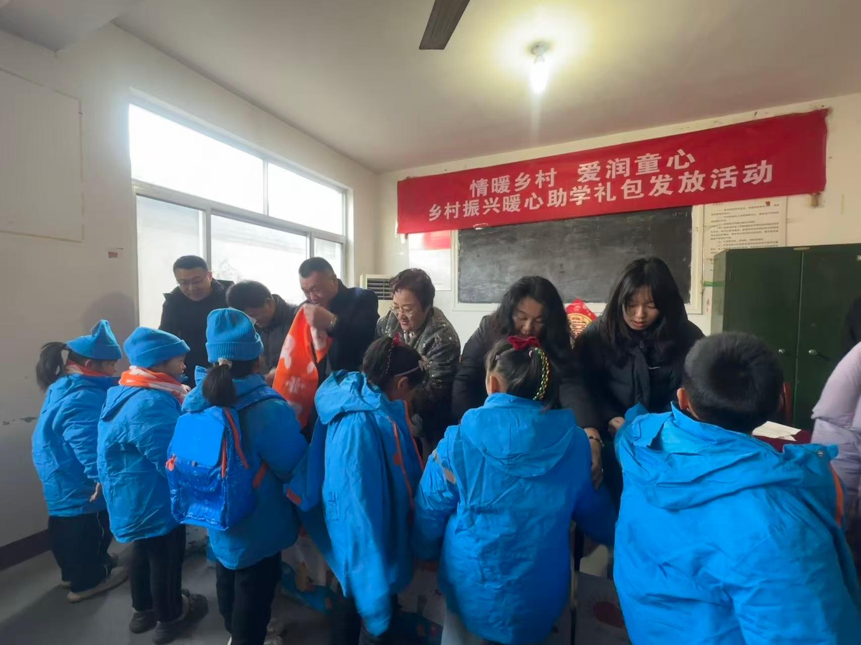 在最暖心的礼包发放环节,各位领导、爱心人士与村“两委”干部共同为 14 名受助儿童亲手送上助学礼包,孩子们接过礼包后,纷纷向爱心叔叔阿姨们鞠躬道谢,稚嫩的声音传递出最真挚的感恩之情。发放仪式结束后,全体参与人员与受助儿童及监护人合影留念,将这一温暖瞬间定格。