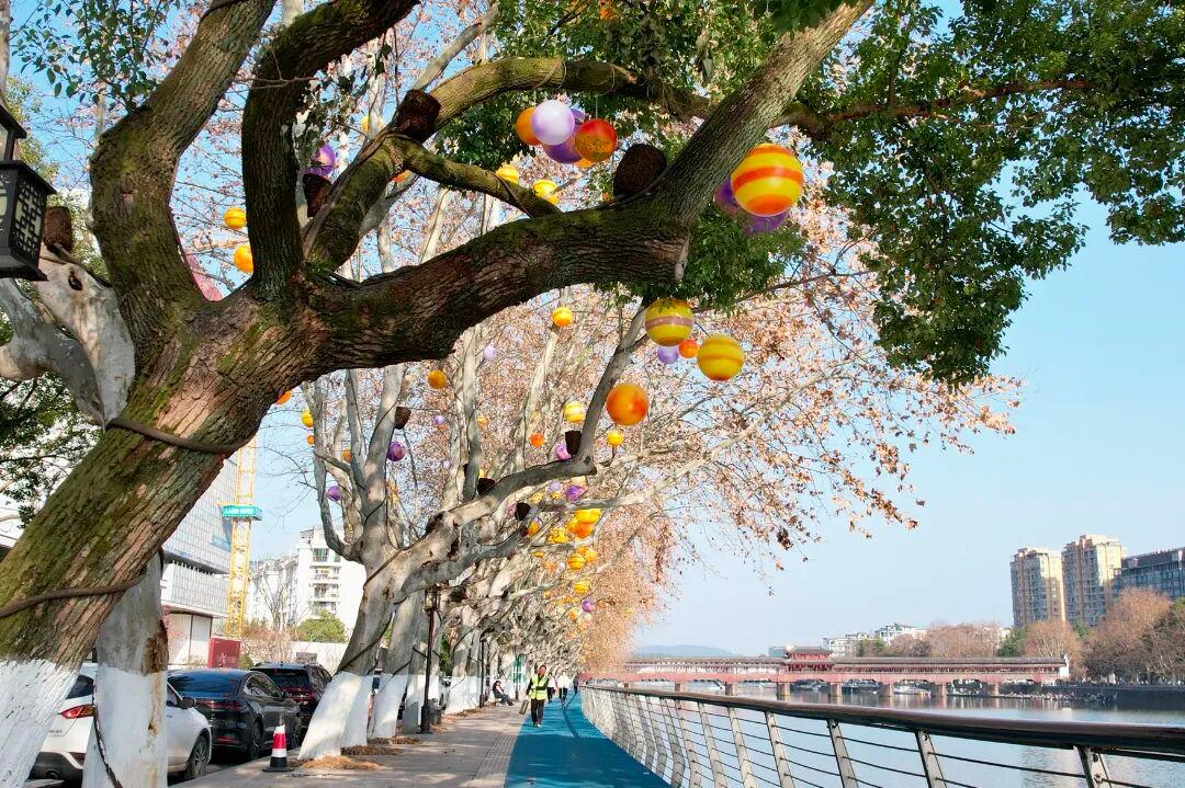 走进熟溪北路,行道树上已经挂满了各色彩灯,远远望去,枝头流光点点,格外引人注目。夜幕降临,暖黄色的灯光依次亮起,深浅交织、错落有致,光影层层叠叠铺洒开来,整条街道都化作了温馨雅致的光影长廊。日夜双景,各具韵味。