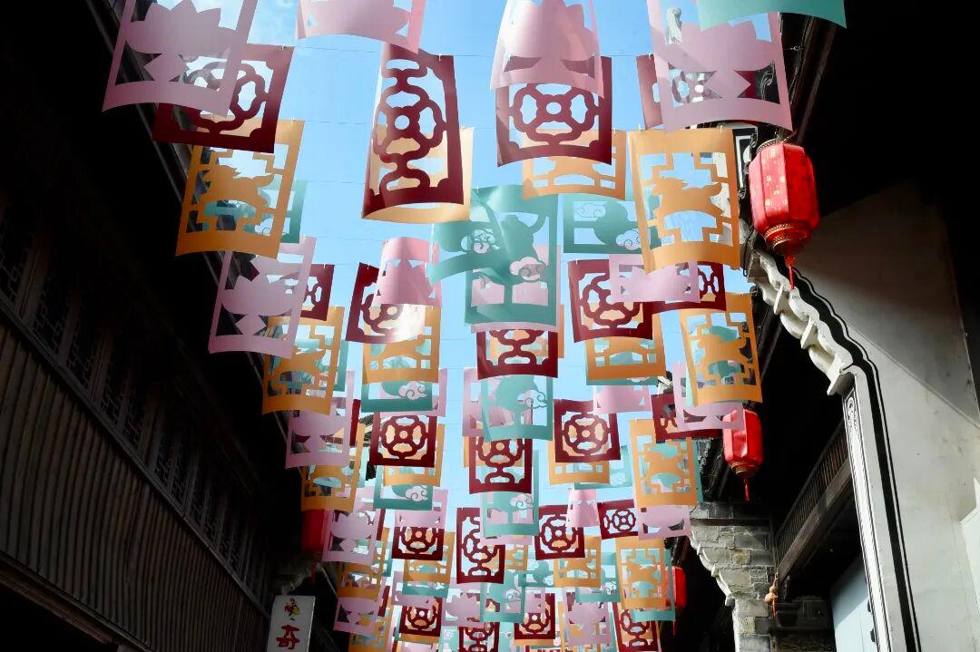 古街上方,骏马奔腾、祥云舒卷的剪纸窗花沿路悬挂。一幅幅精巧别致的纹样在微风里轻摇。阳光透过镂空,将吉祥的寓意映落在石板路上,抬眼低头,皆是人间烟火。