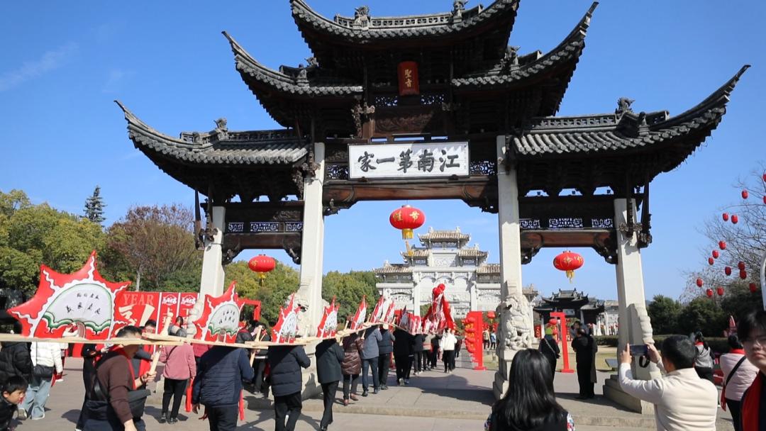 江南第一家不仅是景区,更是活态的家风课堂。景区今年特意打造了浦江最大的板凳龙子灯,巨龙缀彩披红,瞬间成为游客争相合影的“新晋顶流”。围绕“家”与“年”的主题,景区推出“龙舞·传训”“家风·入礼”等四大沉浸式活动。游客不仅能肩扛以《郑氏规范》一百六十八条家规为根基制作的“家训龙”沉浸式巡游,还能在昌七公祠品尝“浦江家宴”。在品尝浦江豆腐皮、杨梅馃、馒头焐肉等特色美食的同时,听“家主”讲解孝义文化。来自上海的游客赵大妈感慨不已:“在江南第一家的祠堂里,大家能坐在一起吃个团圆饭,非常满足!”