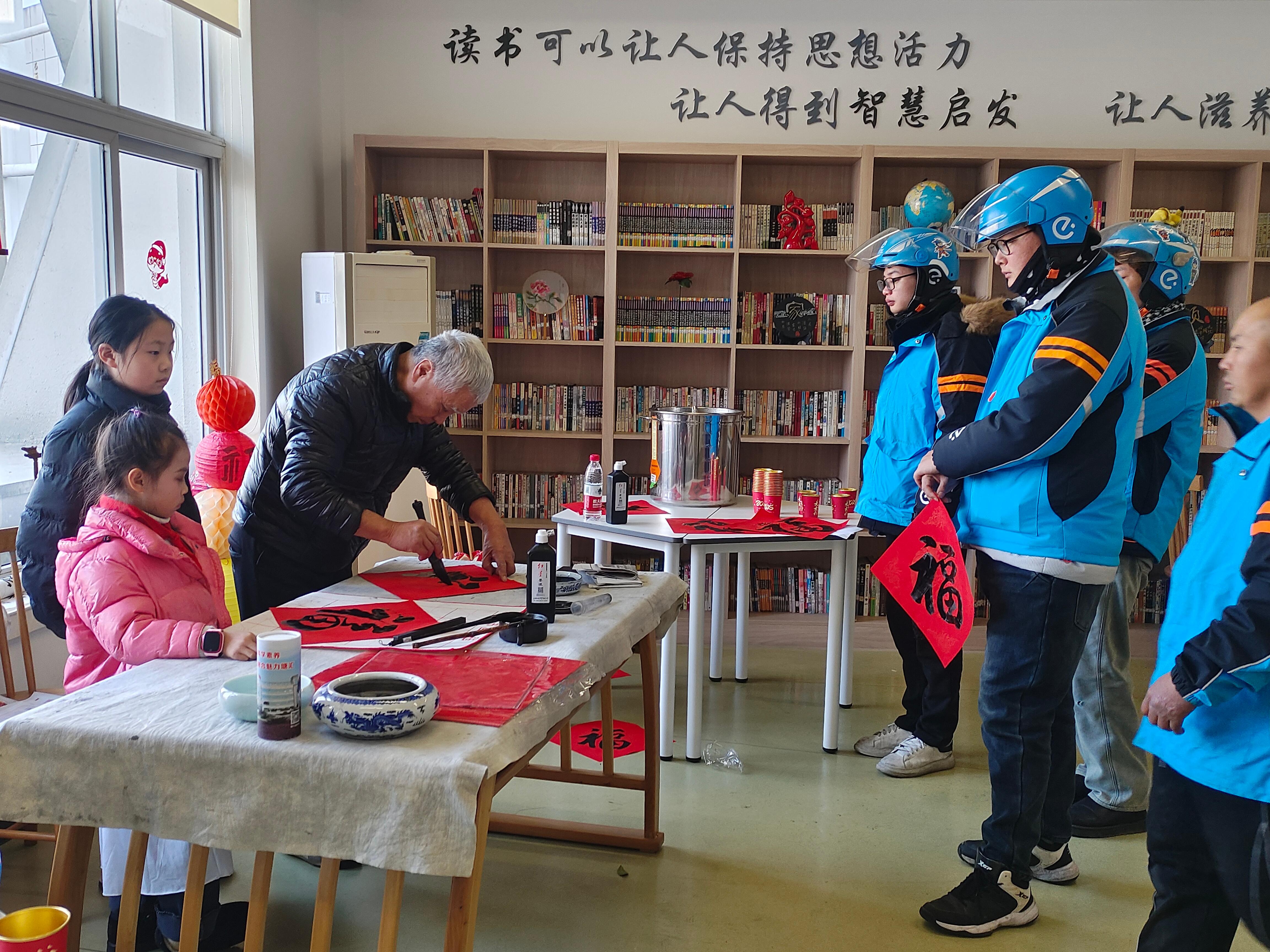 而孩子们,也在悄悄长大。他们不再只是课堂上的学生,而是成了街头巷尾的“文化小使者”。年货节上,他们摆开摊子挥毫泼墨;社区志愿活动中,他们专门为外卖员、快递员写“福”。一位穿着蓝色工装的外卖小哥接过红彤彤的福字,笑着说:“我们每天跑来跑去,很少收到这样的礼物,谢谢小朋友!”那一瞬间,墨香和暖意,在冬日的街头交融。