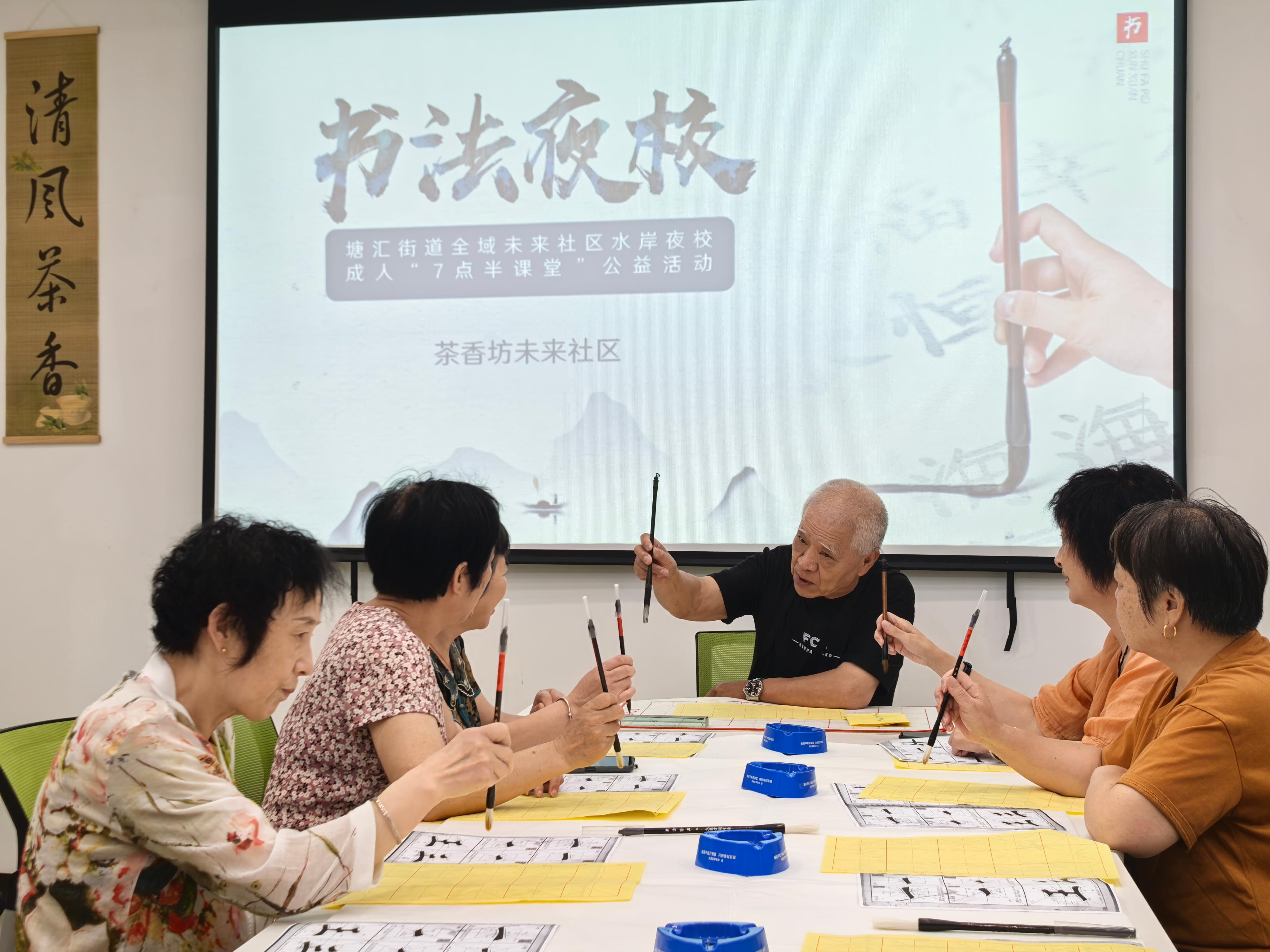 原来,社区在网格走访中发现,许多老年人也有书法的愿望——年轻时没机会学,现在闲下来了,也想握一握那支笔。于是,“茶香坊未来社区书法夜校”开课了,陈启明再次站上讲台,每周三的夜晚,活动室总是灯火通明。七旬的张阿姨第一次握笔时,手抖得厉害,笔尖在纸上直打颤。陈启明老师一笔一画教她写“天”字。一个月后,张阿姨能稳稳地写出整整齐齐的楷书了。她举着自己的作品,眼里闪着孩子般的光:“现在我每天回家都要练几笔,日子都过得充实了。”