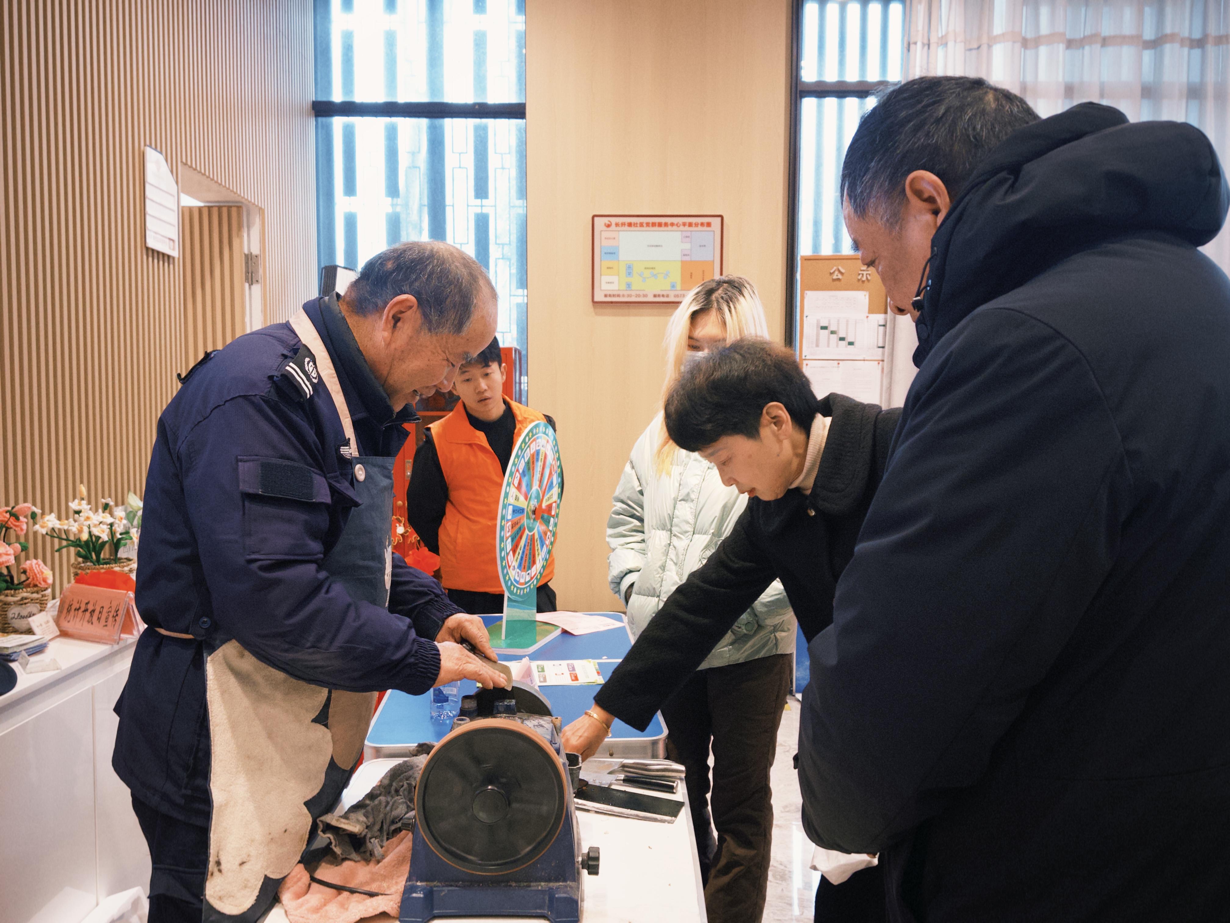 便民服务“零距离”,贴心守护暖万家。活动现场特设一站式便民服务专区,集结了多位身怀绝技的志愿者,为居民带来实打实的便利。家里有钝了的剪刀、难用的菜刀?师傅现场免费帮忙打磨,让旧物重焕锋芒。家里的小家电罢工?维修达人坐镇检修,帮您排查故障、解决难题。同时,社区还邀请了塘汇卫生院的医护人员开展免费义诊,提供血压测量、健康咨询、慢病指导等服务,守护居民身体健康。理发志愿者带来公益义剪,为居民剪出精气神,传递暖心关怀。