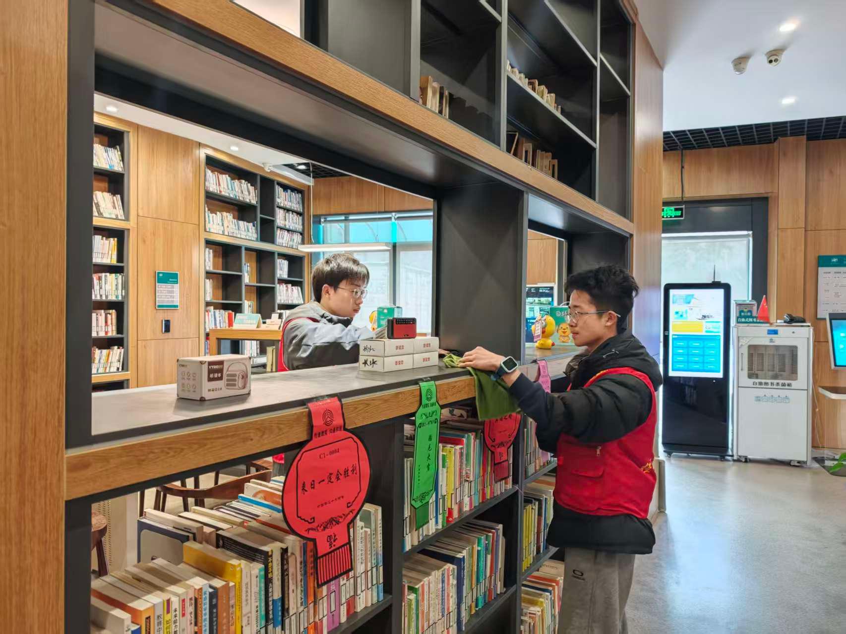 活动伊始,在图书管理员的简单分工后,身着红马甲的志愿者们迅速投入“工作”。他们分工协作,有的拿着抹布仔细擦拭书架和阅读桌椅,不放过任何一个卫生死角;有的小心翼翼地将读者归还的图书按索书号分类归位,将摆放错乱的书籍重新“护送回家”。经过他们的努力,原本稍显凌乱的书架变得整齐划一,整个书房环境焕然一新,散发着浓浓的书香气息。