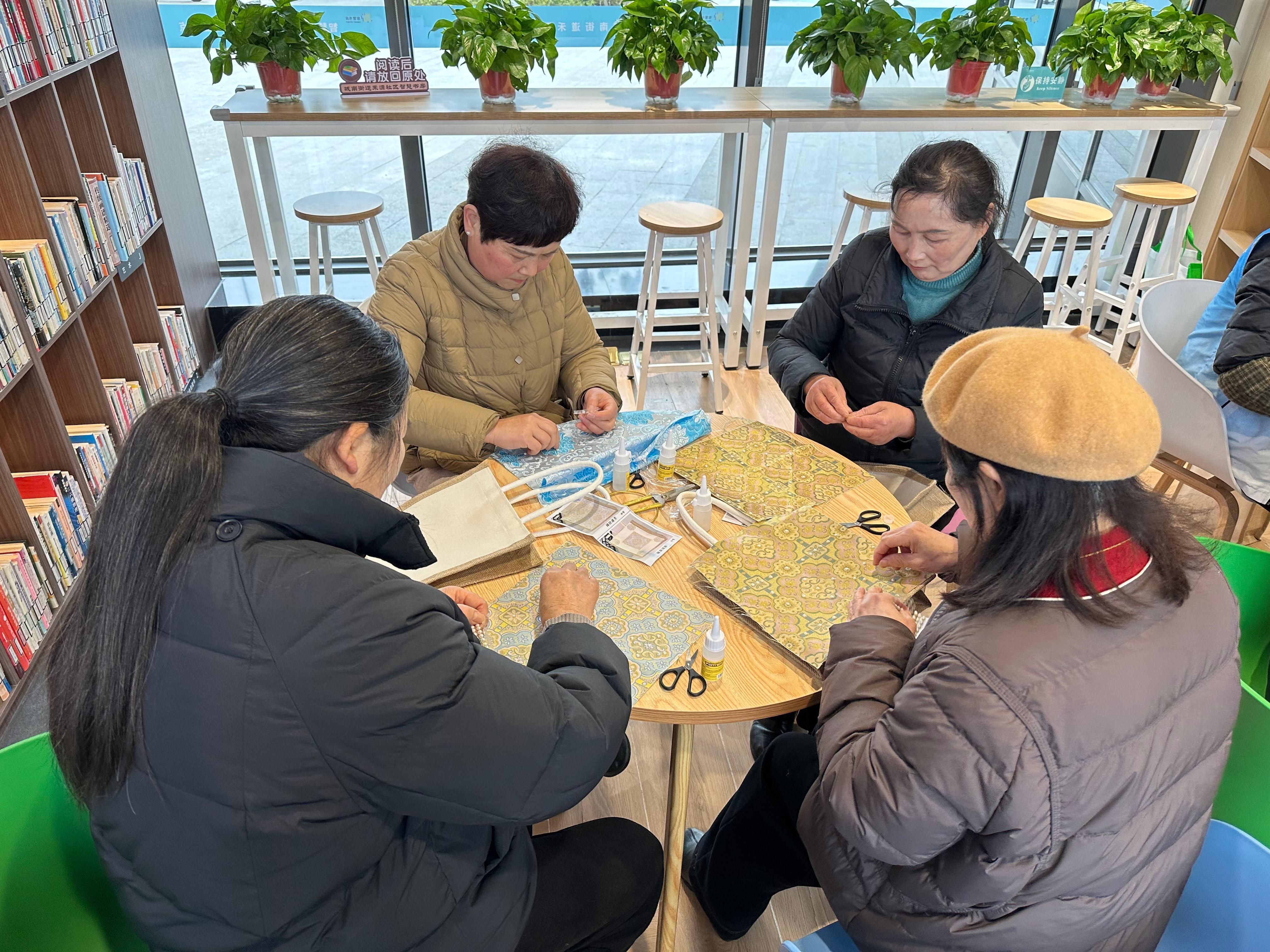 手工制作环节,社区为大家准备了齐全的宋锦面料、布包底座、装饰配件等材料。导师耐心演示裁剪、粘贴、固定等步骤,细致解答大家遇到的疑问。妇女代表们兴致高昂,纷纷投入创作,或认真比对纹样,或精心搭配配饰,相互交流技巧、分享创意,现场氛围温馨融洽。一针一线间,一块块精致的宋锦面料,逐渐变成了一个个兼具实用性与观赏性的手工布包,每一件作品都承载着大家对美好生活的向往,也展现了新时代女性的巧手与风采。