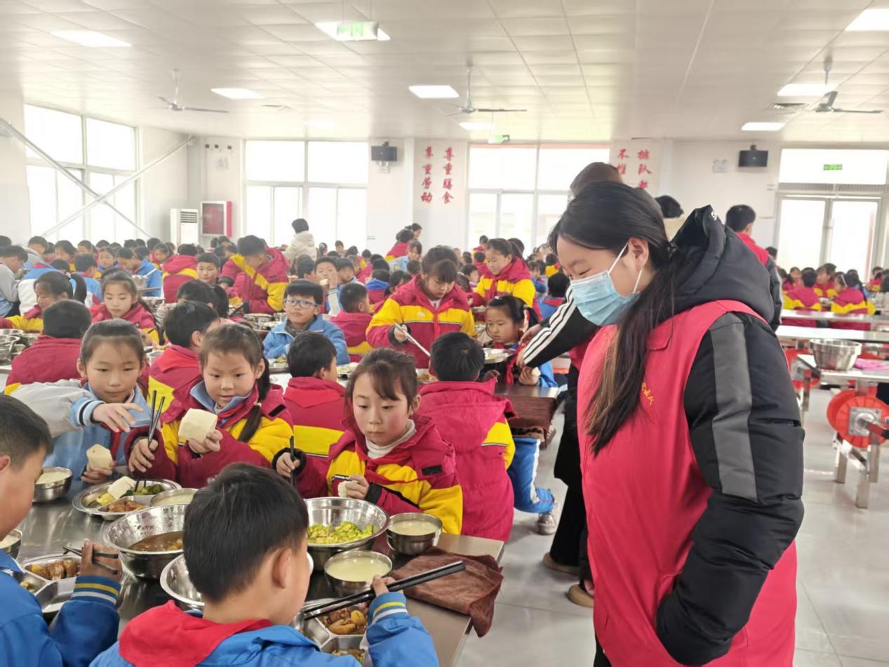 志愿服务暖童心,爱心护航助成长。在戴庙镇中心小学,返乡大学生化身“爱心使者”,全力投身“免费午餐”项目,开展志愿服务。活动中,学子们提前到岗,协助工作人员做好食材整理、餐具消毒、餐食分装等工作,全程细致把控用餐安全。用餐期间,主动维护就餐秩序,关心学生的饮食喜好和成长近况,耐心引导养成不挑食、不浪费的良好习惯,让免费午餐暖胃更暖心,学子们也在志愿服务中体会到爱心奉献的价值与意义。