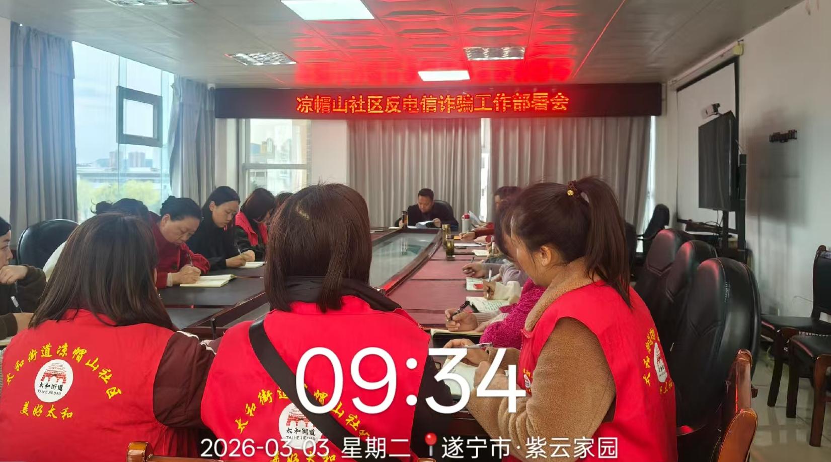 3月3日,凉帽山社区组织召开反电信诈骗工作部署会,社区全体工作人员参会。会议深入分析当前电信网络诈骗的新形势、新特点,结合辖区老年人口多、流动人口分布广的实际情况,明确反诈宣传重点与分工。会议强调,要将反诈宣传作为社区民生工作的重要抓手,通过 “线上 + 线下” 双轨模式,实现宣传全覆盖、无死角;针对老年人、务工人员等易受骗群体,要制定个性化宣传方案,精准传递反诈知识,切实筑牢社区反诈安全网。