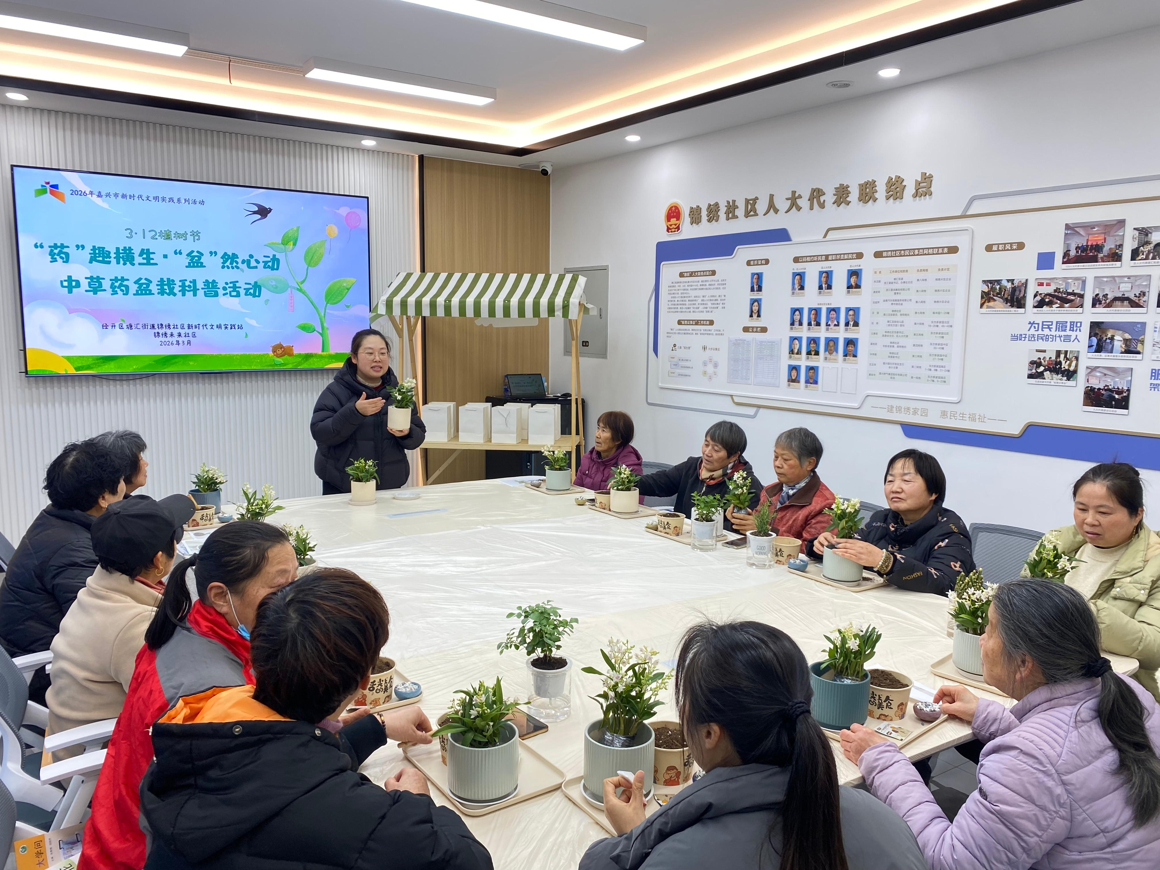 3月6日下午,嘉兴经开区塘汇街道锦绣社区开展的中草药盆栽种植活动正火热进行。来自辖区的各族居民在中药师带领下,通过沉浸式的互动体验,在家门口解锁了中医药文化的趣味新玩法。
