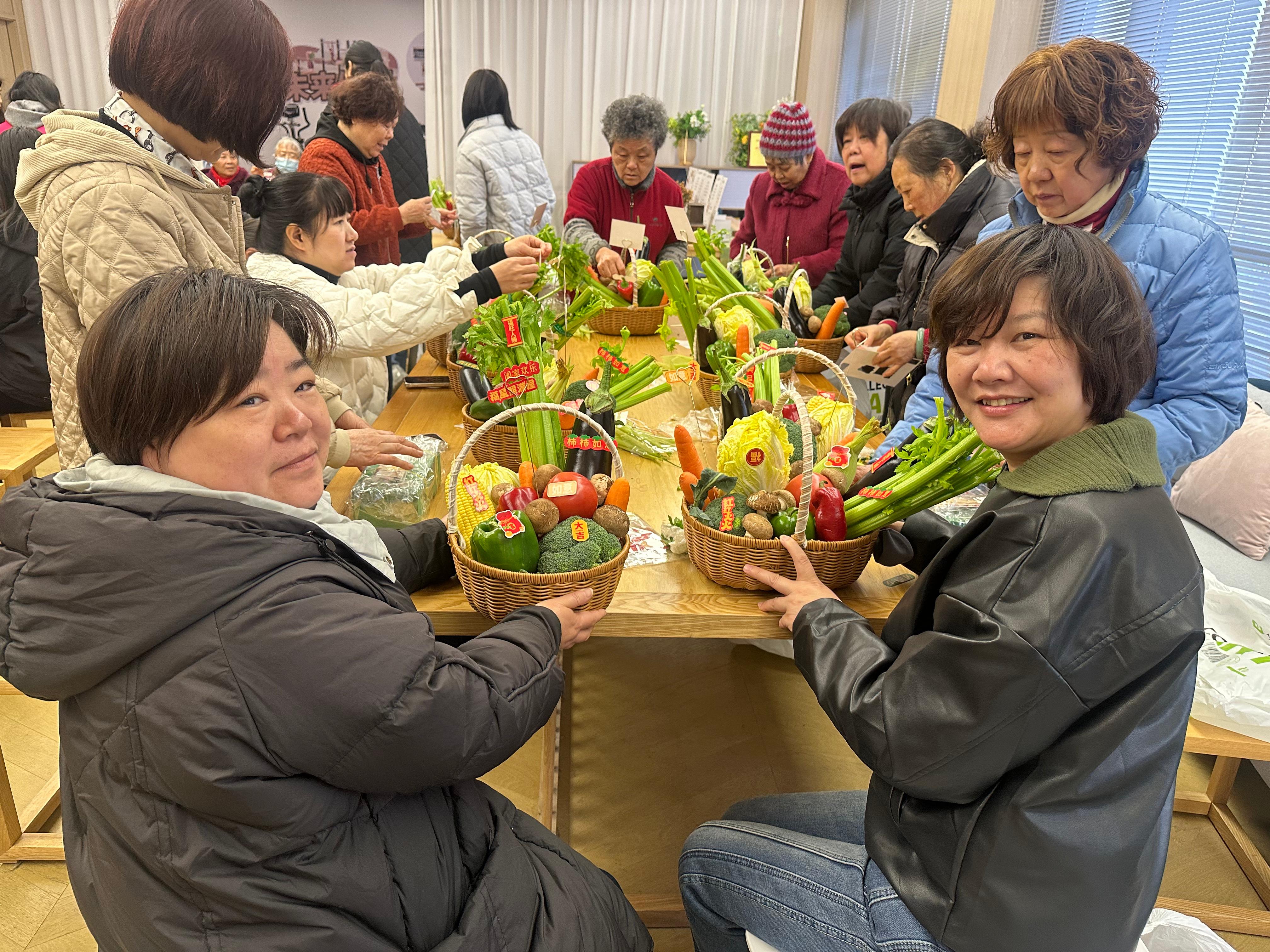 在志愿者的引导下,大家兴致勃勃地开始动手创作,她们发挥想象力,精心挑选着心仪的蔬菜,或切片,或整颗,或穿插,巧妙地将各种蔬菜搭配在一起,再用竹签固定,插入花泥之中,现场气氛热烈而融洽,大家互相交流着配色思路和造型心得,欢声笑语不断。不一会儿,一个个造型独特、错落有致、饱含创意的蔬菜花篮便在巧手中诞生了,这些花篮不仅色彩缤纷,更散发着独特的“蔬香”,将日常生活的烟火气息与艺术美感完美融合。