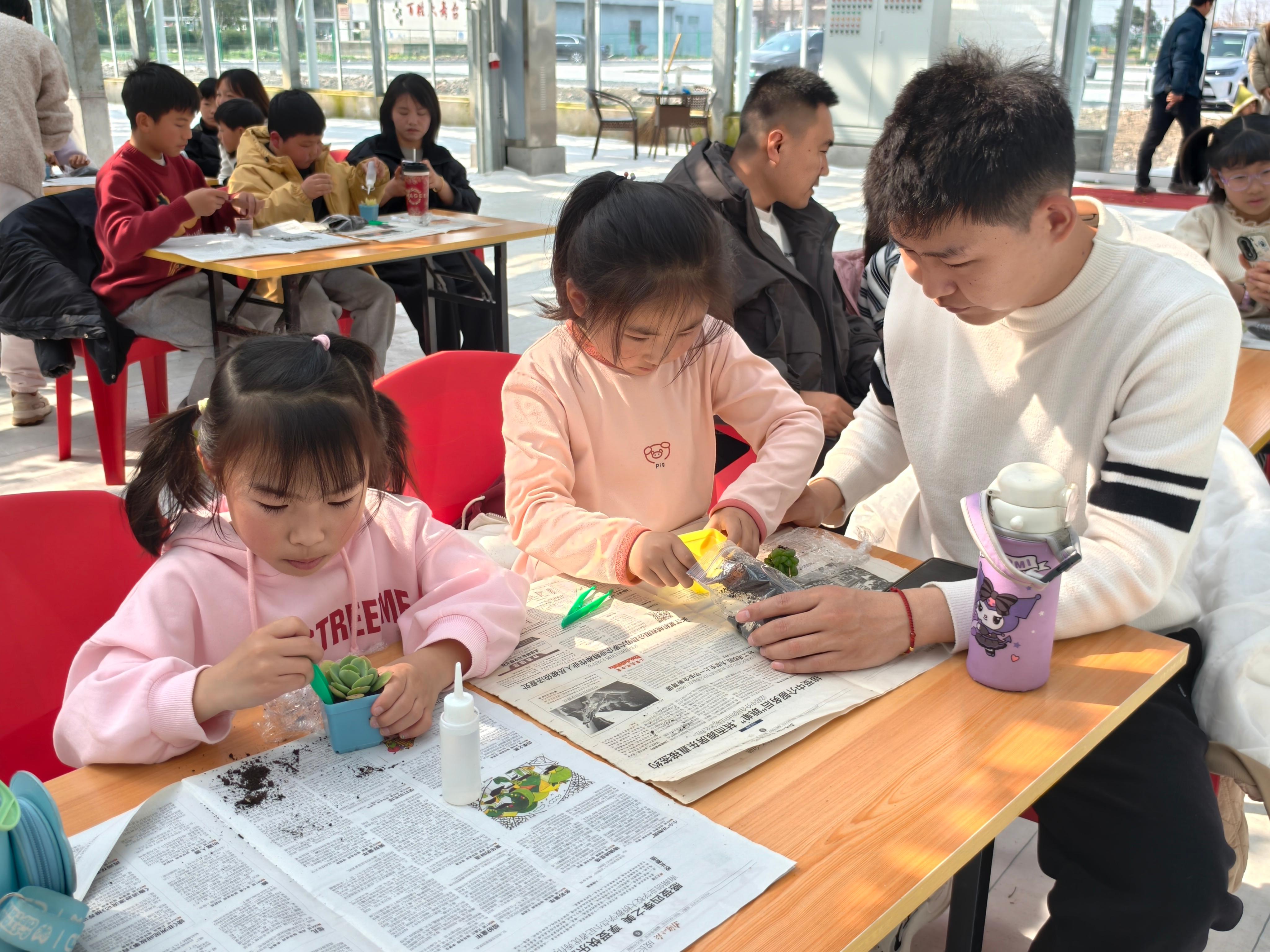 趣味互动环节中,小朋友们迫不及待地挑选着可爱的多肉植株。在带队老师的指导下,家长与孩子默契配合,填土、放苗、压实,一步步种下属于自己的小绿植。期望这份亲手培育的植株,能将“植绿、护绿”的理念带去家中。随后的亲子采摘环节里,引导员细致讲解采摘技巧与安全规范,孩子们牵着家长的手,穿梭在果蔬间体验采摘乐趣,亲手摘下新鲜的当季水果,感受劳动的喜悦与收获的美好,活动现场欢声笑语不断。