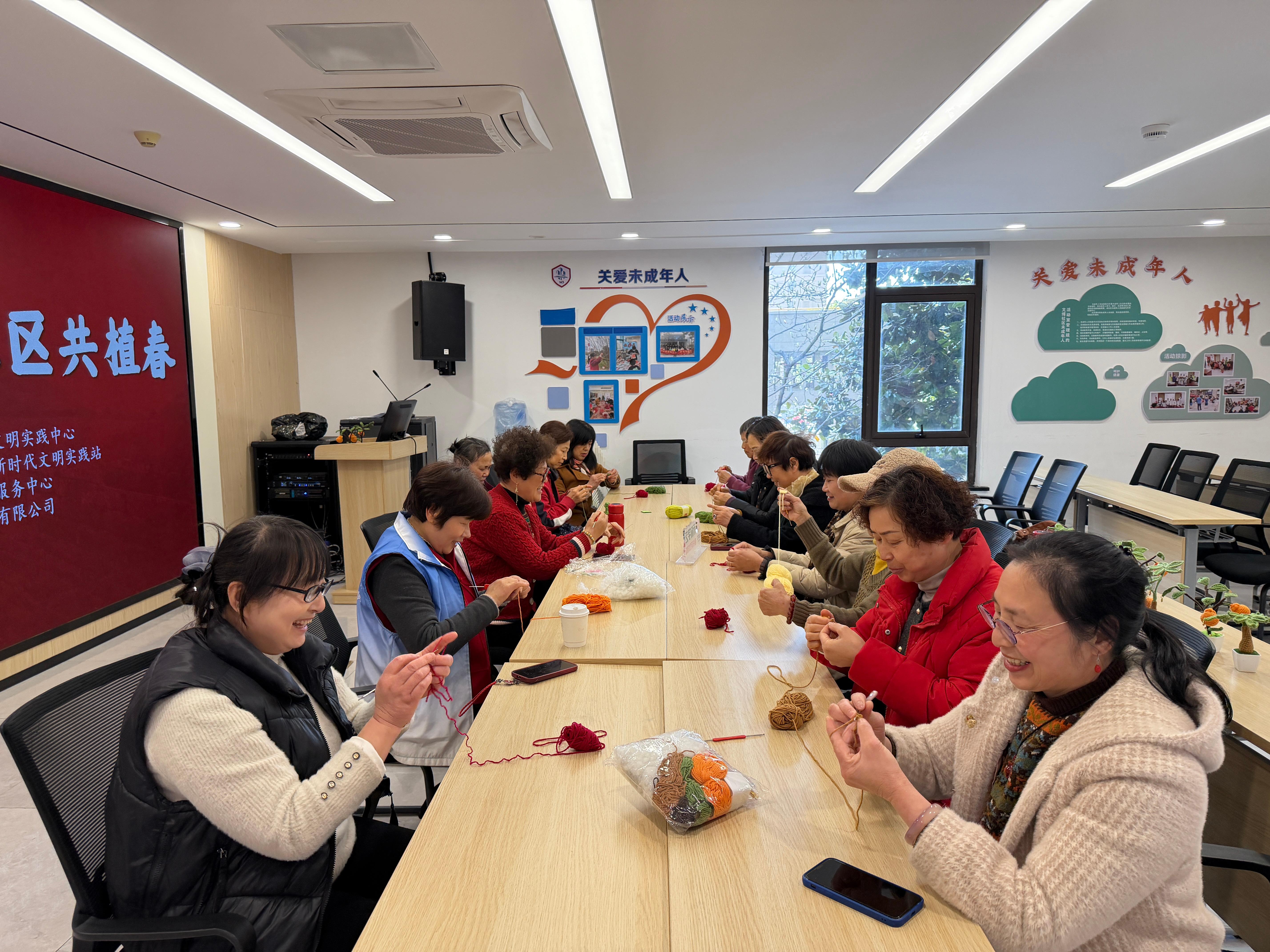 此次活动创新采用手工编织的形式,打破传统植树的局限,让居民在室内也能感受春日生机、践行环保理念。活动现场,巾帼志愿者耐心向参与居民讲解编织技巧,从绕线、打结到塑形,一步步细致示范,手把手指导大家完成作品。同时,还结合活动主题,向居民普及垃圾分类知识,讲解可回收手工材料的再利用技巧,引导大家树立“绿色低碳、循环利用”的环保意识,让环保理念从手工创作延伸到日常生活的每一个细节。