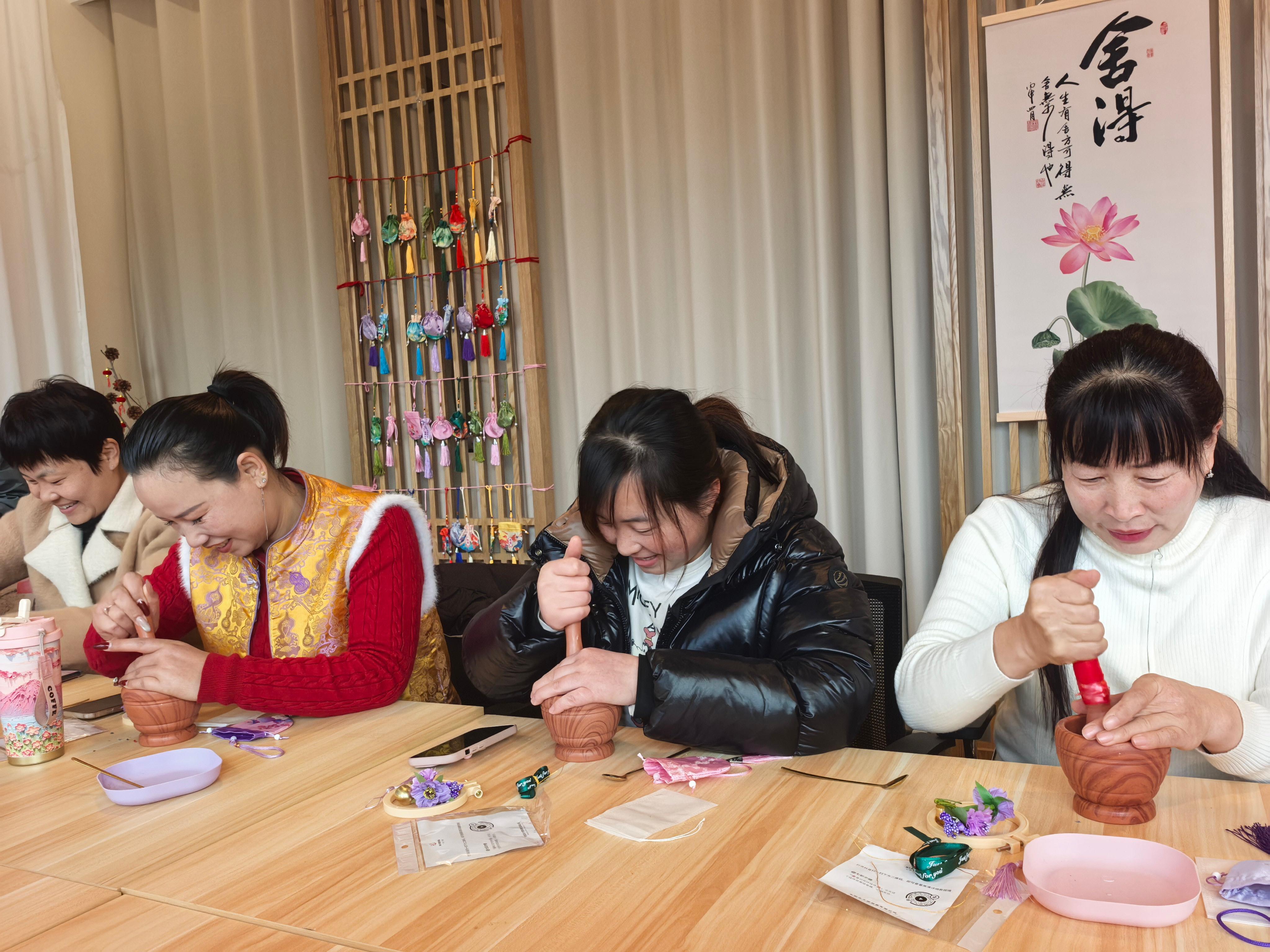 工作人员介绍了艾叶、白芍等常见中药材的功效特点,围绕散寒止痛、疏肝理气等作用进行科普讲解,结合民宿从业实际,传授实用的健康保健知识,引导大家树立健康生活理念。大家按照配比将中药材研磨粉碎,装入囊中并精心装饰,制作出一个个香气浓郁、美观实用的中药香囊。