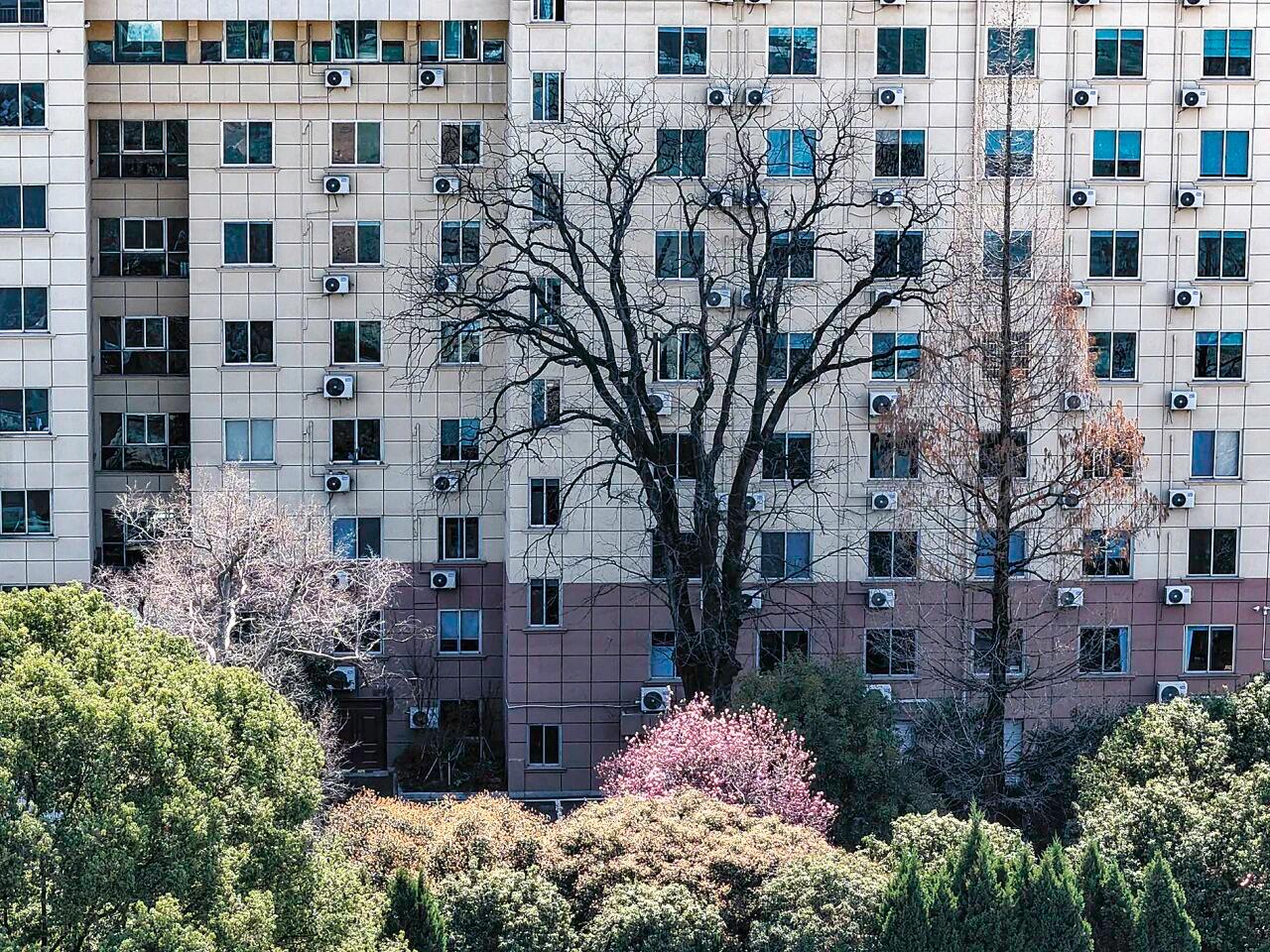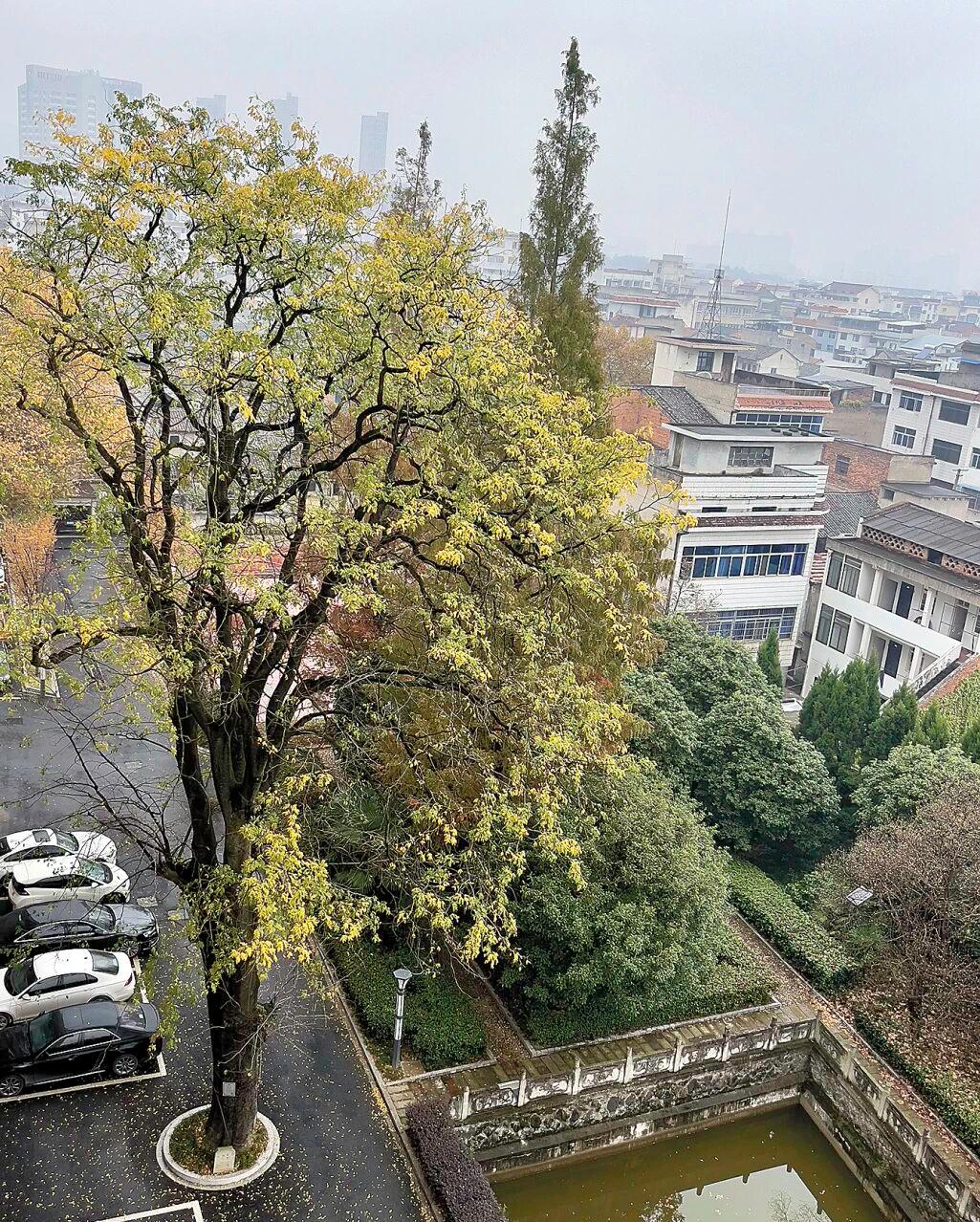 在吴宁街道办事处,藏着一株高27米、树龄300多年的皂荚树。这棵树见证了两次大楼建设:1978年后建五层办公大楼、1993年建十层大楼。两次基础开挖都临近古树根系,施工人员特意调整方案,将树基周围1米多的范围划为“禁区”,全程人工小心作业。正因这份谨慎,这株见证了老城区发展的古树至今苍劲挺拔。皂荚树是落叶乔木,冬天里光秃秃的。上图为目前还未长出新叶的皂荚树。