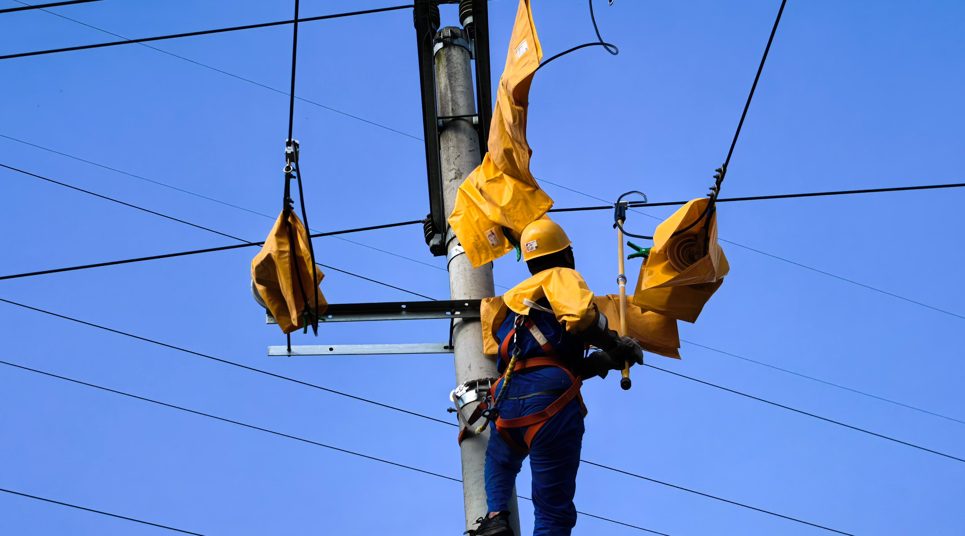 在10千伏大吉线彭井村1社支线1号杆作业现场,带电作业人员全副武装,佩戴专业防护装备,迅速投入战斗。他们严格按照规范流程,有序完成现场安全措施布置、验电等准备工作,智能自动绝缘剥皮器在地面人员的精准操作下,杆稍导线绝缘层逐一被剥掉。随后,大家细致核对引线长度、安装设备线夹,对带电线路进行全面绝缘遮蔽,熟练地开展起引流线搭接作业。高空之上,作业人员严谨细致,规范操作;地面之间,监护人员全程紧盯作业每一个步骤,确保每一次操作精准无误。带电作业在花田间勾勒出电力人坚守一线的动人画面。