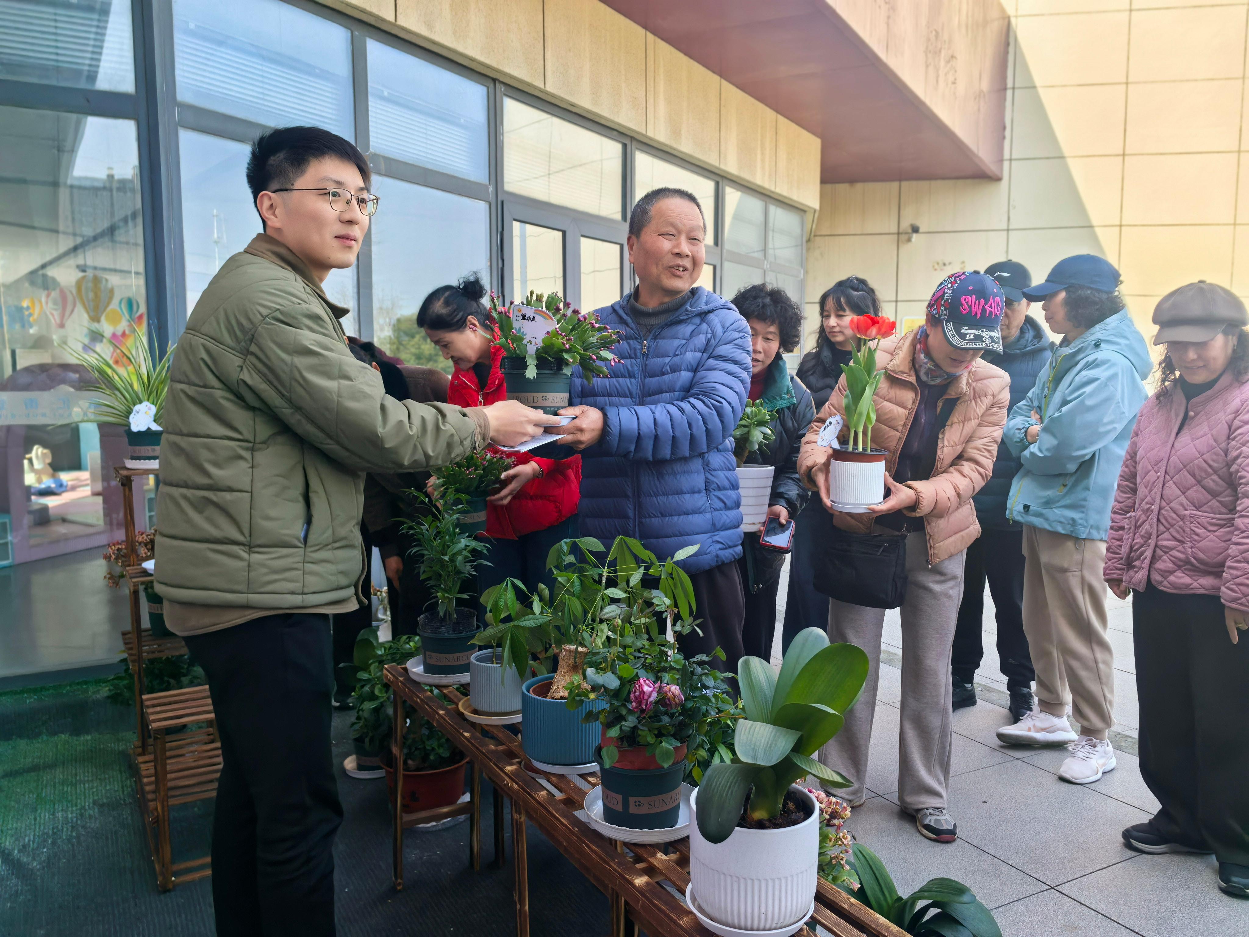 下午14时,活动在简洁而温馨的氛围中拉开帷幕。社区工作人员在花圃区域提前摆放了几个崭新的木质花架,上面错落有致地陈列着各类花卉盆栽,为春日空间增添了一抹亮色。辖区居民及前期通过“未来经开”小程序发布“护花使者”招募令招募的多名志愿者齐聚现场,一起开启社区这一片满园春色的一角。