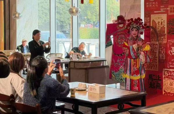 除了外籍客商,不少国内游客和本地市民也专程前来“打卡”。来自上海的郭女士趁着周末错峰来义,刚进餐厅就被眼前的场景吸引,“果然是世界的义乌,身边全是外国友人,加上婺剧表演,氛围感拉满。”她表示,此前仅在电视上见过婺剧,这次近距离观看,真切感受到了非遗艺术的魅力。义乌本地票友王碧清和同伴也专程前来,直言这种“餐饮+文化”的融合形式新意十足,既是一场视觉盛宴,也是传统文化传播的好方式。