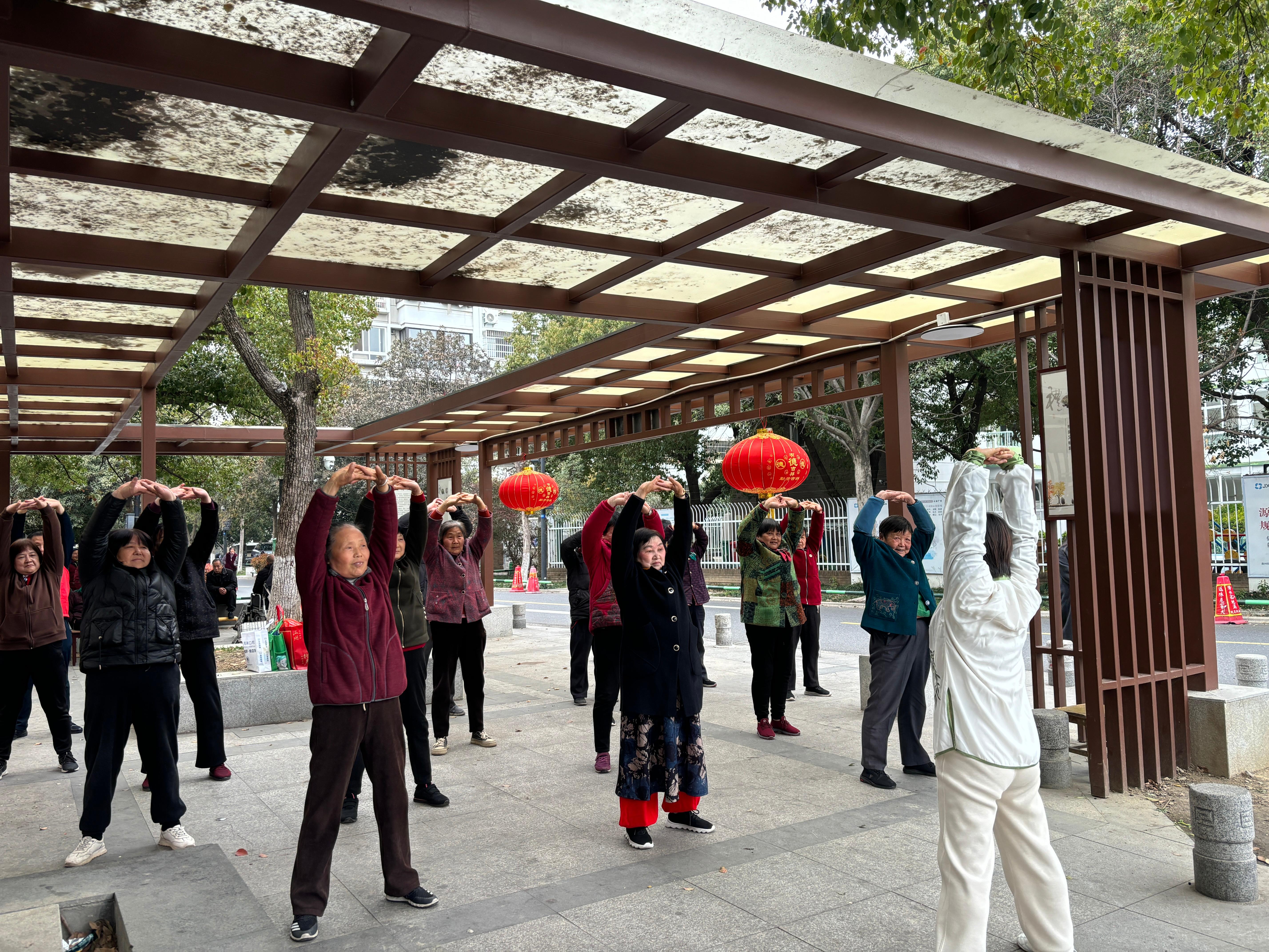 活动伊始,来自嘉兴市中医院的陆医生,以通俗易懂的语言讲解春分养生知识和八段锦的基础动作要领,将每一式动作放缓节奏、逐式拆解、细致示范,全程陪伴在老年朋友身边。老年朋友们精神饱满、认真跟随,先慢练分解动作,反复打磨细节,再连贯完整跟练,抬手、弯腰、转身,动作沉稳有力、有条不紊,脸上始终洋溢着专注与愉悦。遇到动作不标准的地方,老师耐心纠正。对于行动稍缓的老年朋友,工作人员主动上前协助,确保每位老年朋友都能跟上节奏、舒适练习。