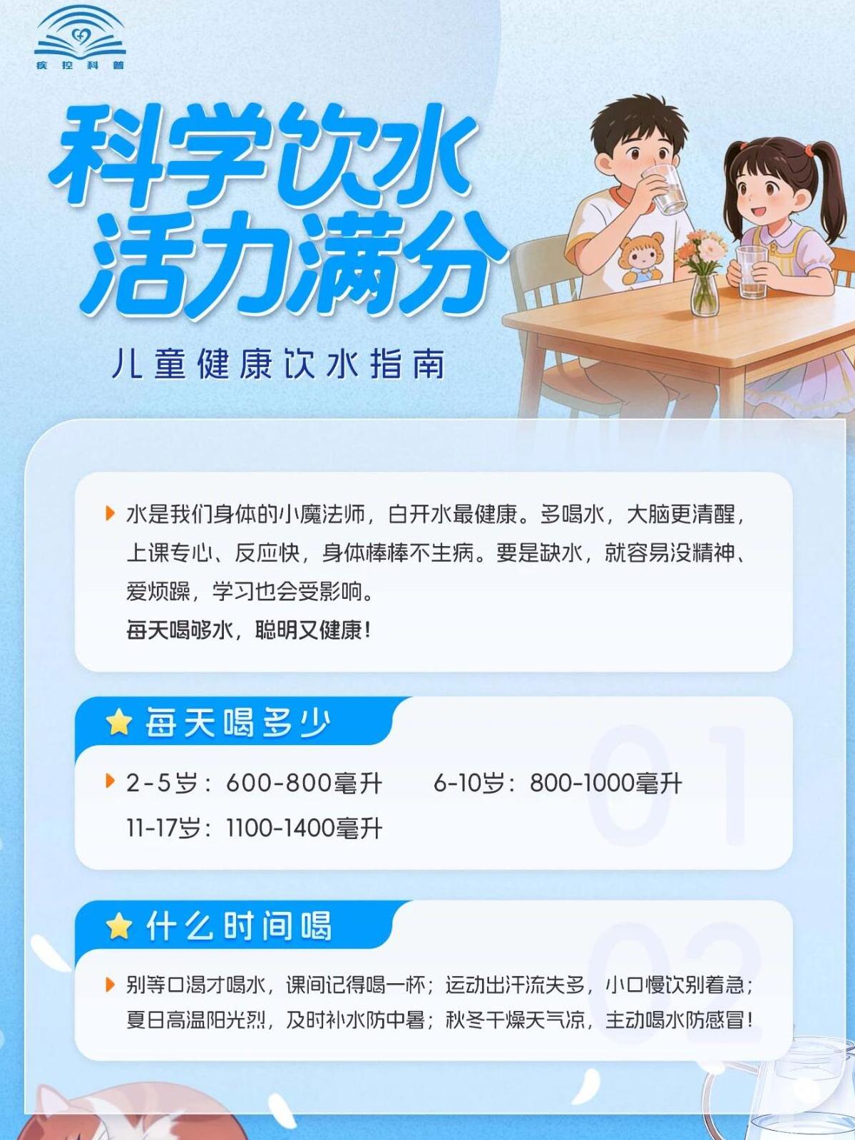 水是我们身体的小魔法师,白开水最健康。多喝水,大脑更清醒,上课专心、反应快,身体棒棒不生病。要是缺水,就容易没精神、爱烦躁,学习也会受影响。
