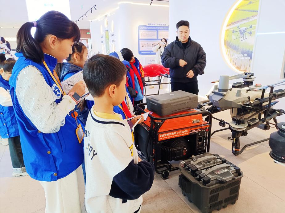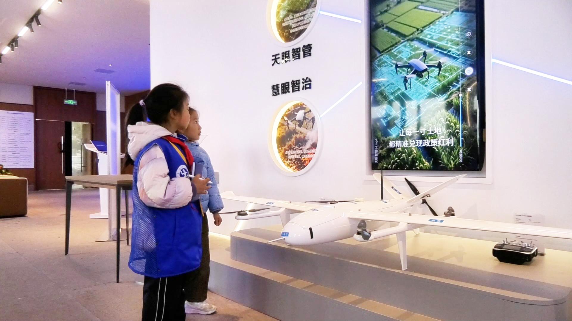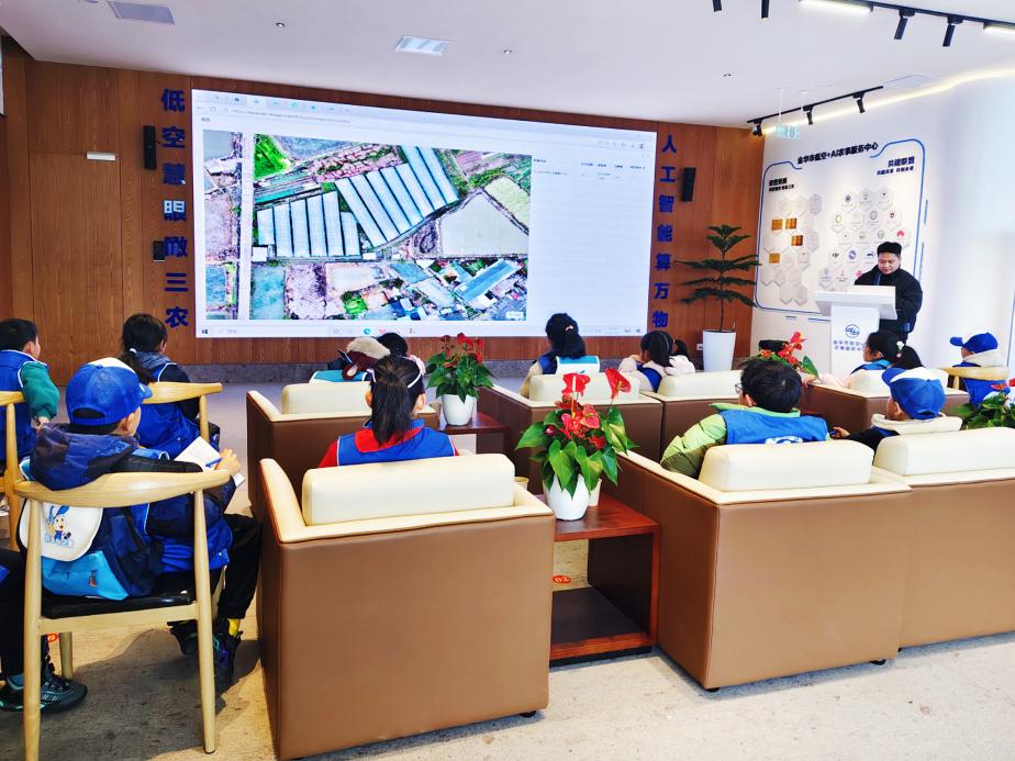 在工作人员的带领下,孩子们参观了科普展厅,动态沙盘与全息投影生动展现了无人机遥感监测、AI数据分析、病虫害监测等全流程智慧农事场景。讲解员用通俗易懂的语言,介绍了中心如何利用低空无人机、物联网传感器和人工智能算法,让传统农耕变得“会思考、能决策”。