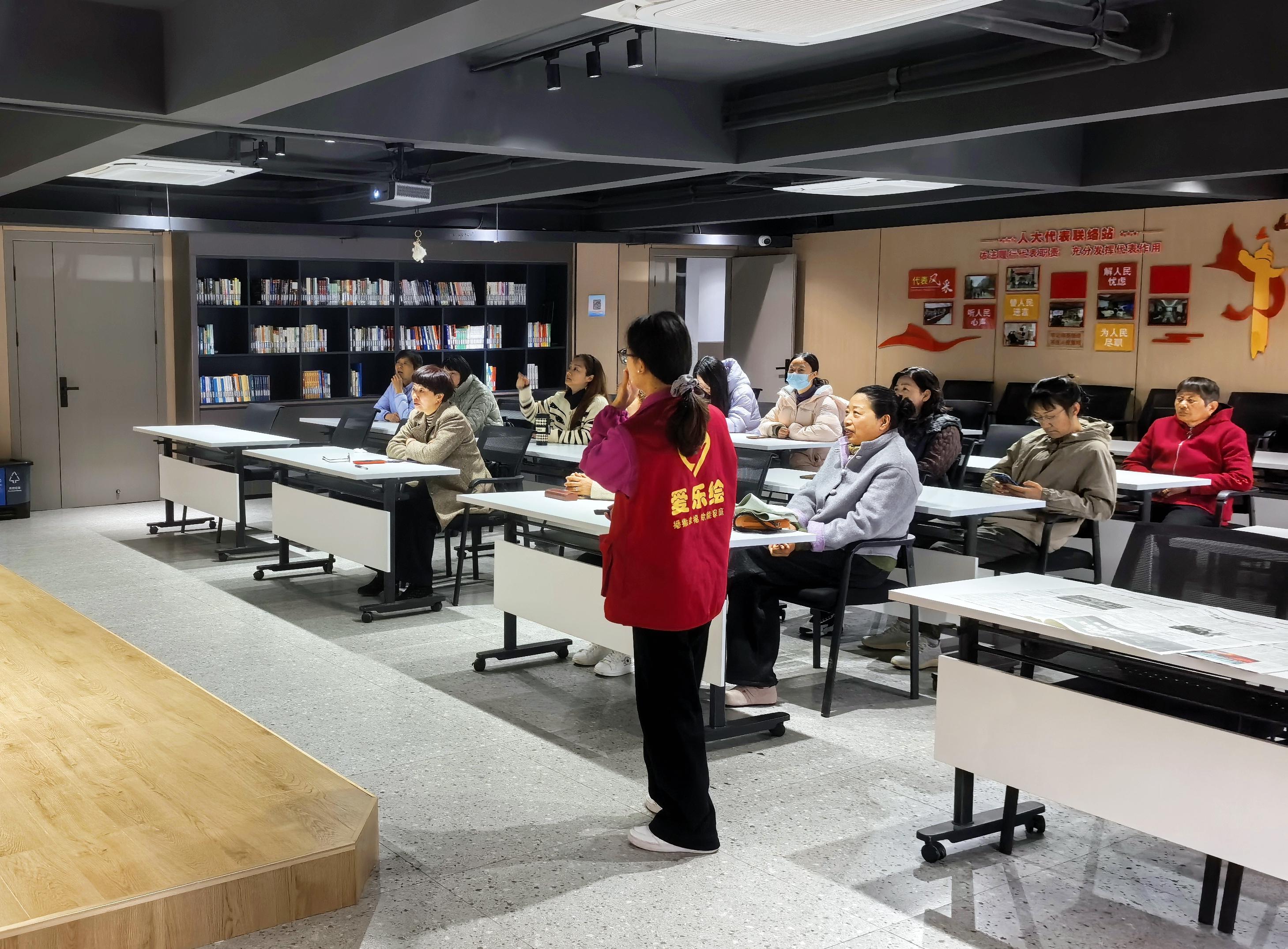 进入制作环节,居民朋友们有序就座,志愿者贴心分发颜料、丝巾、画针等材料包。 志愿者老师全程在现场巡视指导,耐心为有疑问的老人答疑解惑,及时提供手把手帮助。大家兴致盎然,小心翼翼地滴洒颜料、勾勒纹样,每一个动作都专注认真。在大家灵巧的双手下,原本素净的丝巾在水面上渐渐晕染出独一无二的美丽图案,现场洋溢着专注而愉悦的氛围。
