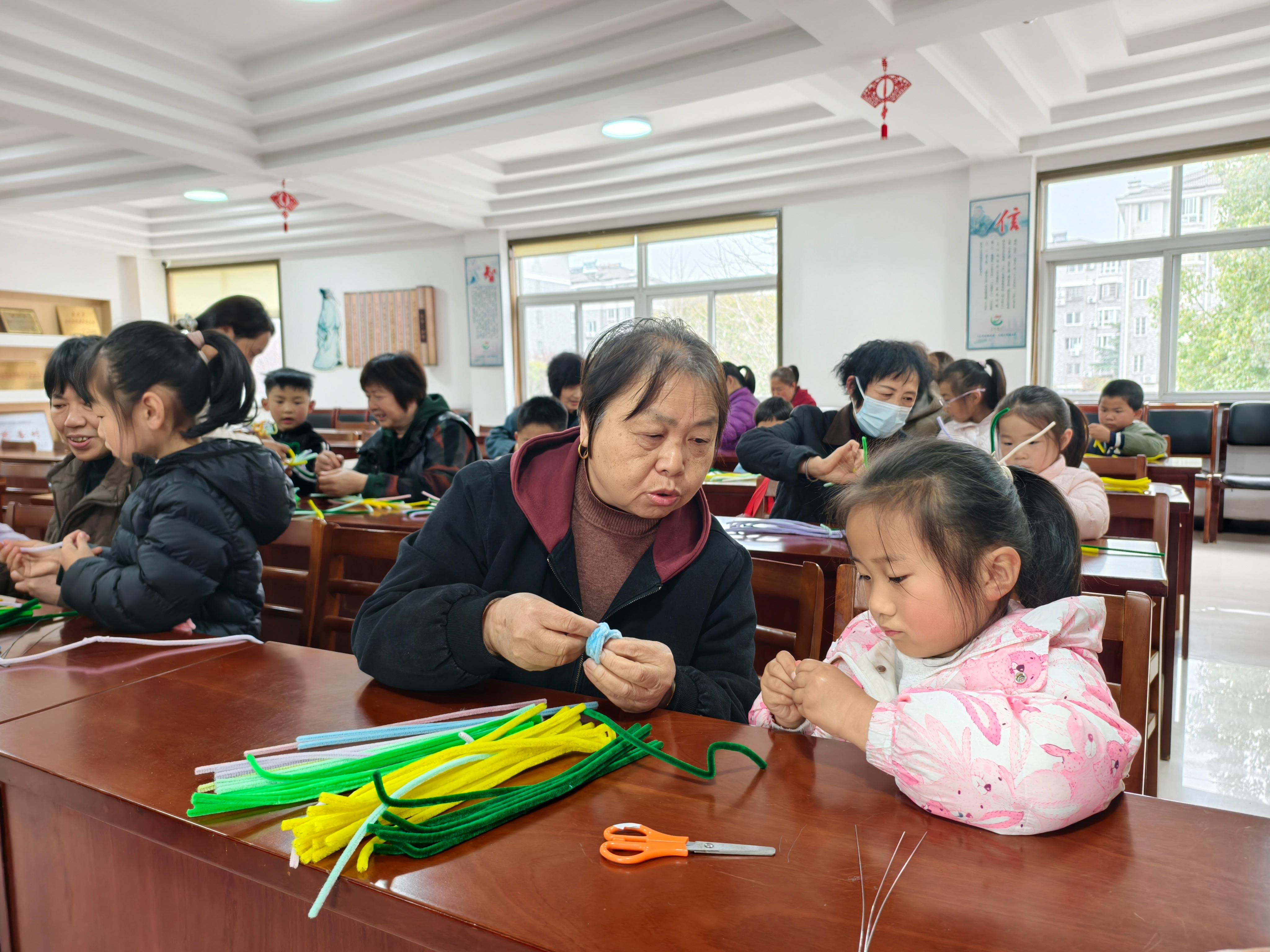 活动现场,10组“忘年搭档”围坐在摆满彩色扭扭棒的工作台前。幼儿园的“小老师们”小手拿着彩色的扭扭棒,认真地讲解扭扭花的制作手法,老年人们手持扭扭棒,学着小孩子教授的弯折技巧,先将扭扭棒对折,再轻轻扭转出花瓣的形状,都有模有样地跟着操作,大家充分发挥创意,你帮忙我调整花朵位置,我协助你制作枝叶。不一会儿,原本普通的彩色扭扭棒在大家的共同努力下,化作了一朵朵栩栩如生的菊花、百合。孩子们把自己亲手制作的扭扭花放进展示栏内,几十朵扭扭花色彩鲜艳,每一朵都承载着对文明新风的独特诠释。