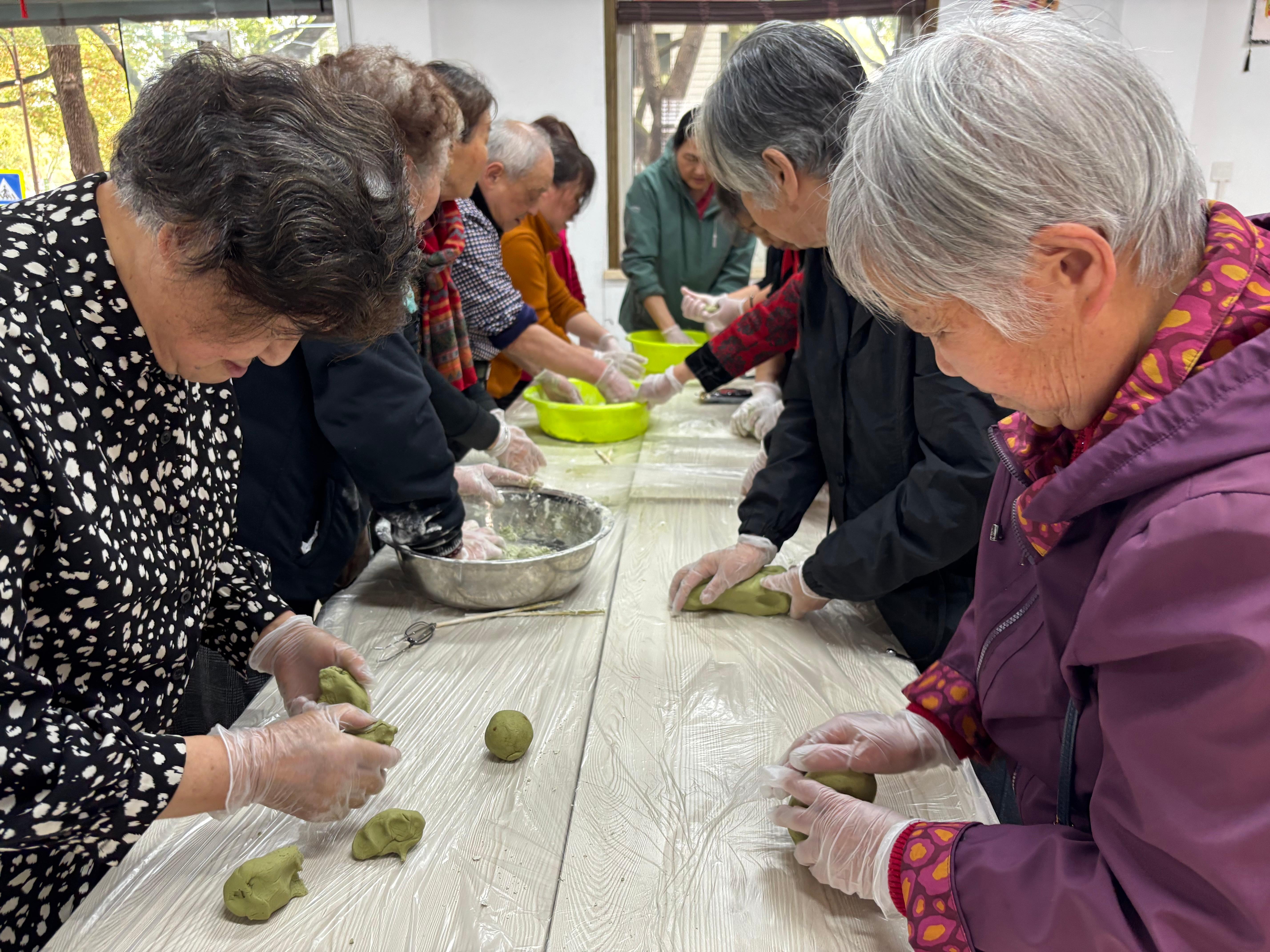 而“做青团”点位则弥漫着浓浓的春天气息。揉面、包馅、搓圆……大家分工合作,将豆沙、春笋等馅料裹进碧绿的糯米团中,在指尖揉捏出清明独有的时令味道。