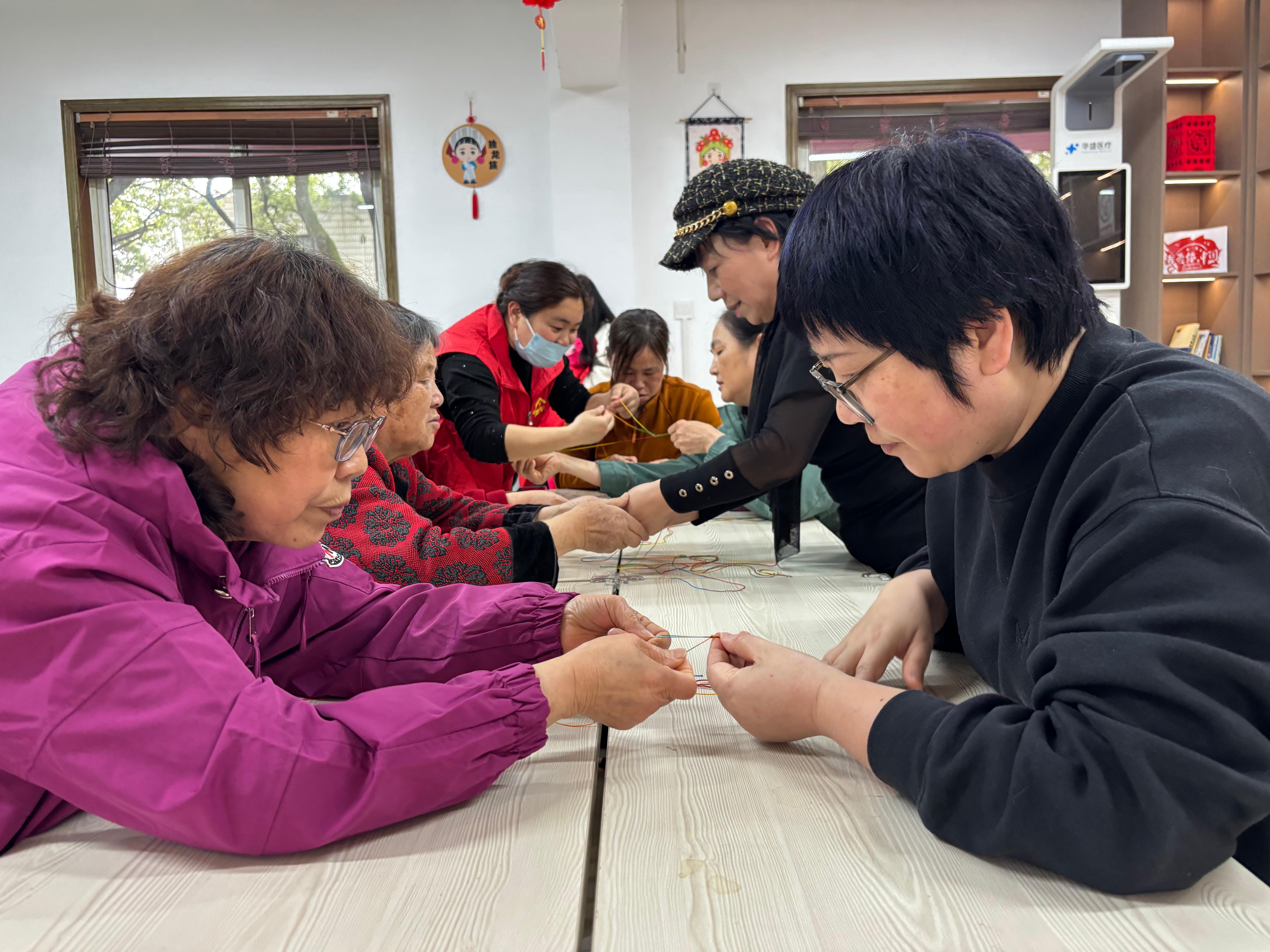 在“编彩绳”点位,居民们手中五彩丝线穿梭交织。彩绳又称“长命缕”,清明佩戴有祈福纳吉、驱邪避灾之意。在嘉科养老志愿者的引导下,大家一边编织,一边互赠祝福,将美好的心愿系于腕间。