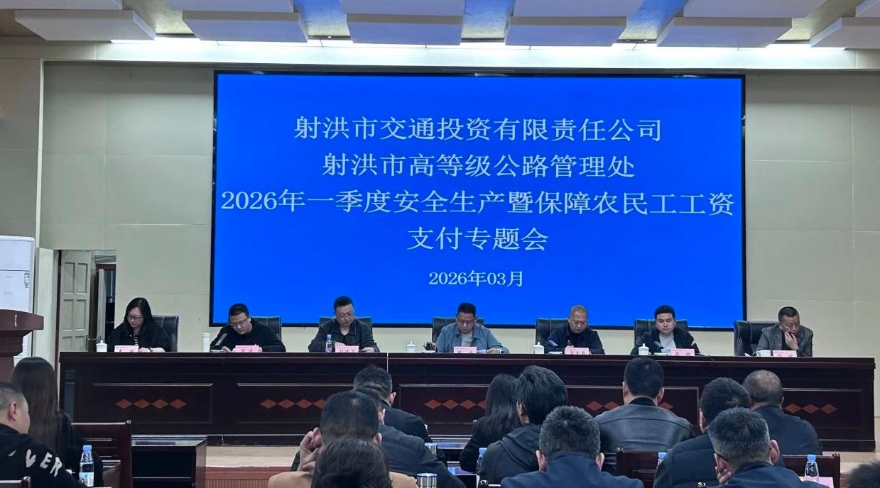 社区文化网(苏勤 谢涵)为深入贯彻落实上级关于安全生产和农民工权益保障的工作部署,压紧压实企业主体责任,有效防范化解各类风险隐患,3月30日,射洪市交投公司组织召开2026年一季度安全生产暨保障农民工工资支付专题会。公司党委书记、董事长陈皓主持会议,班子成员、相关部门及子公司负责人,各在建项目施工、监理单位负责人参会。
