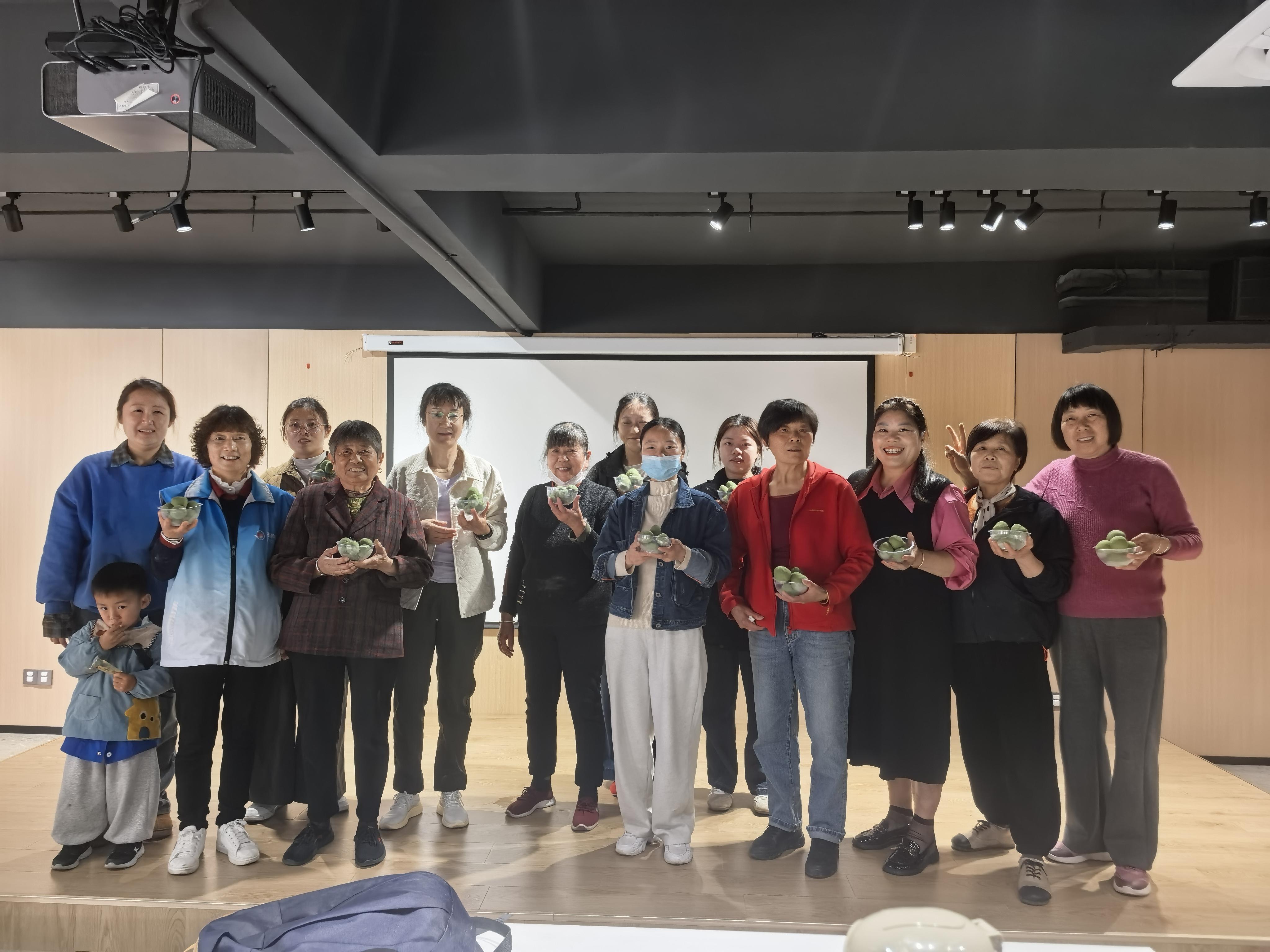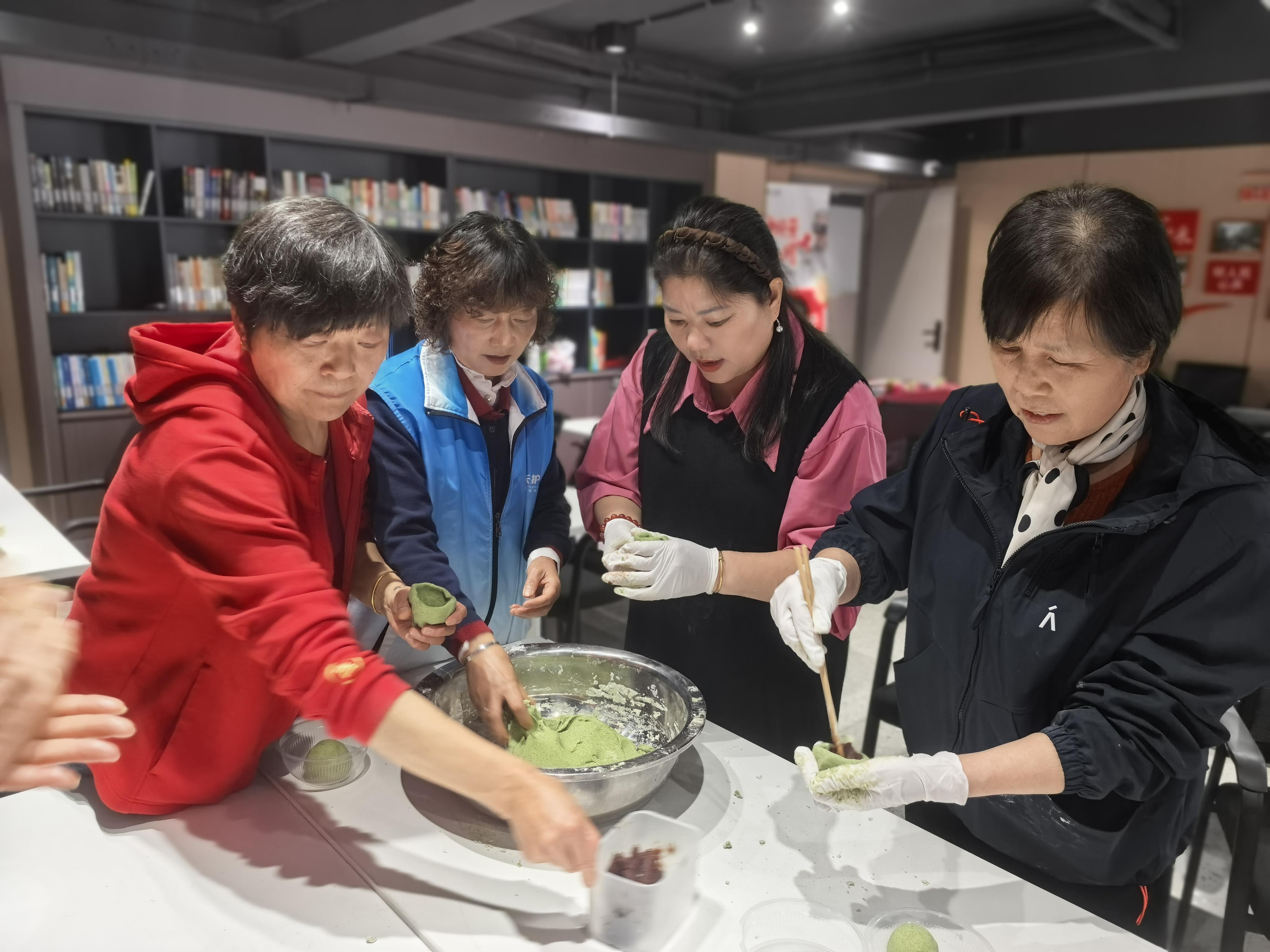 老人们围坐桌边,兴致盎然地动手操作:揉面、捏皮、包馅、搓圆……一双双巧手将春天的绿意与邻里温情,揉进一个个圆润饱满的青团中。经验丰富的老人主动指导初次尝试的同伴,大家互相协作、交流心得,其乐融融。活动中老人们唠家常、话节气,欢声笑语间,青团清香四溢,现场洋溢着浓浓的烟火气与幸福感。