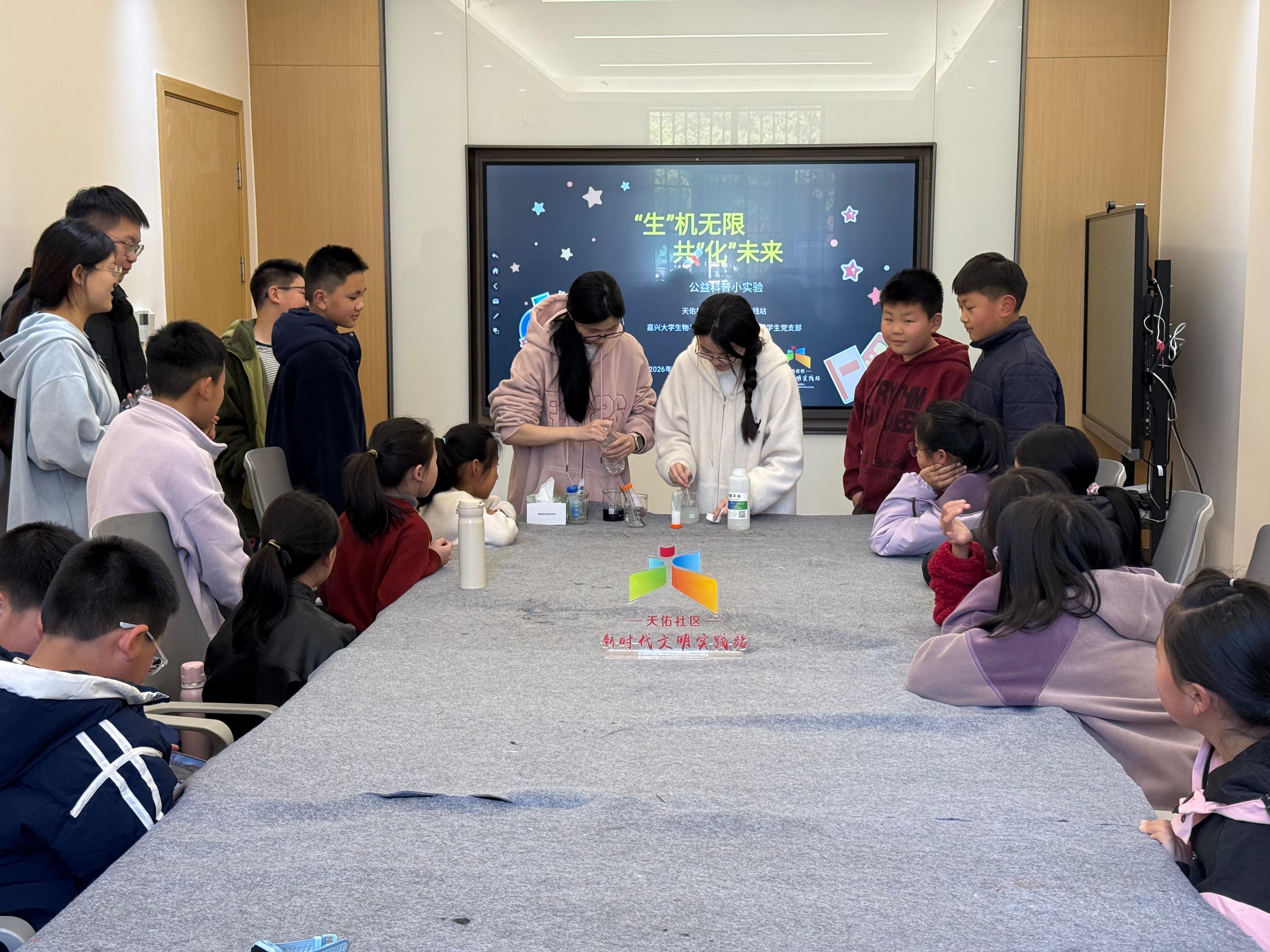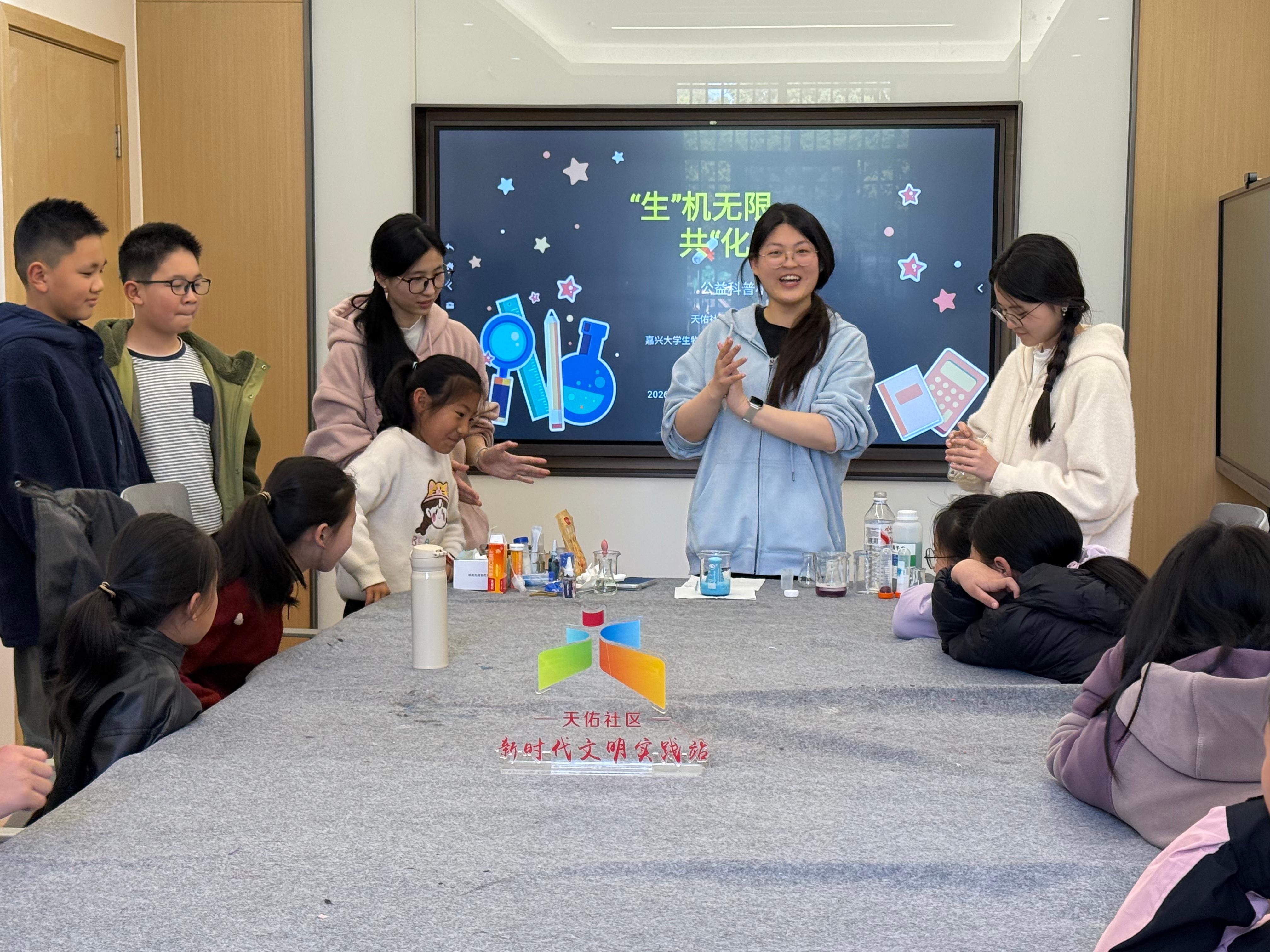 为点亮青少年科学梦想,推动社科普及,守护未成年人健康成长,嘉兴市经开区城南街道天佑社区新时代文明实践站联合嘉兴大学生物与化学工程学院环境工程学生党支部,开展“‘生’机无限,共‘化’未来”科普实践活动。大学生志愿者以趣味实验为载体,把严谨化学知识化作浪漫视觉盛宴,让孩子们在观察、操作与思考中感受科学魅力,种下探索未知的种子。