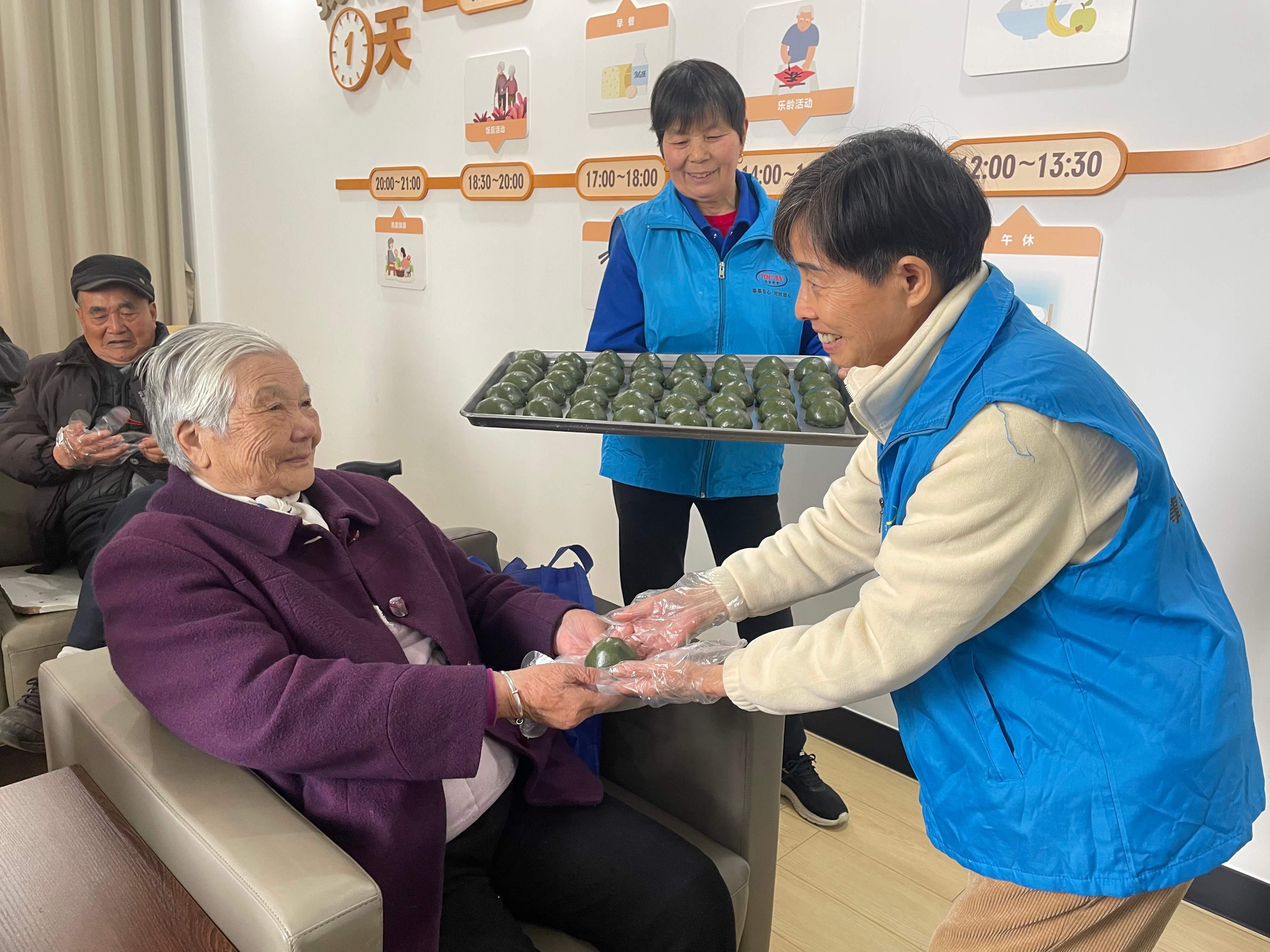 青团制作完成后,工作人员将制作好的青团分享给活动室的邻里。一份份热气腾腾的青团,传递的不仅是邻里间的温情暖意,更是孝老爱亲、和睦邻里的优良家风。