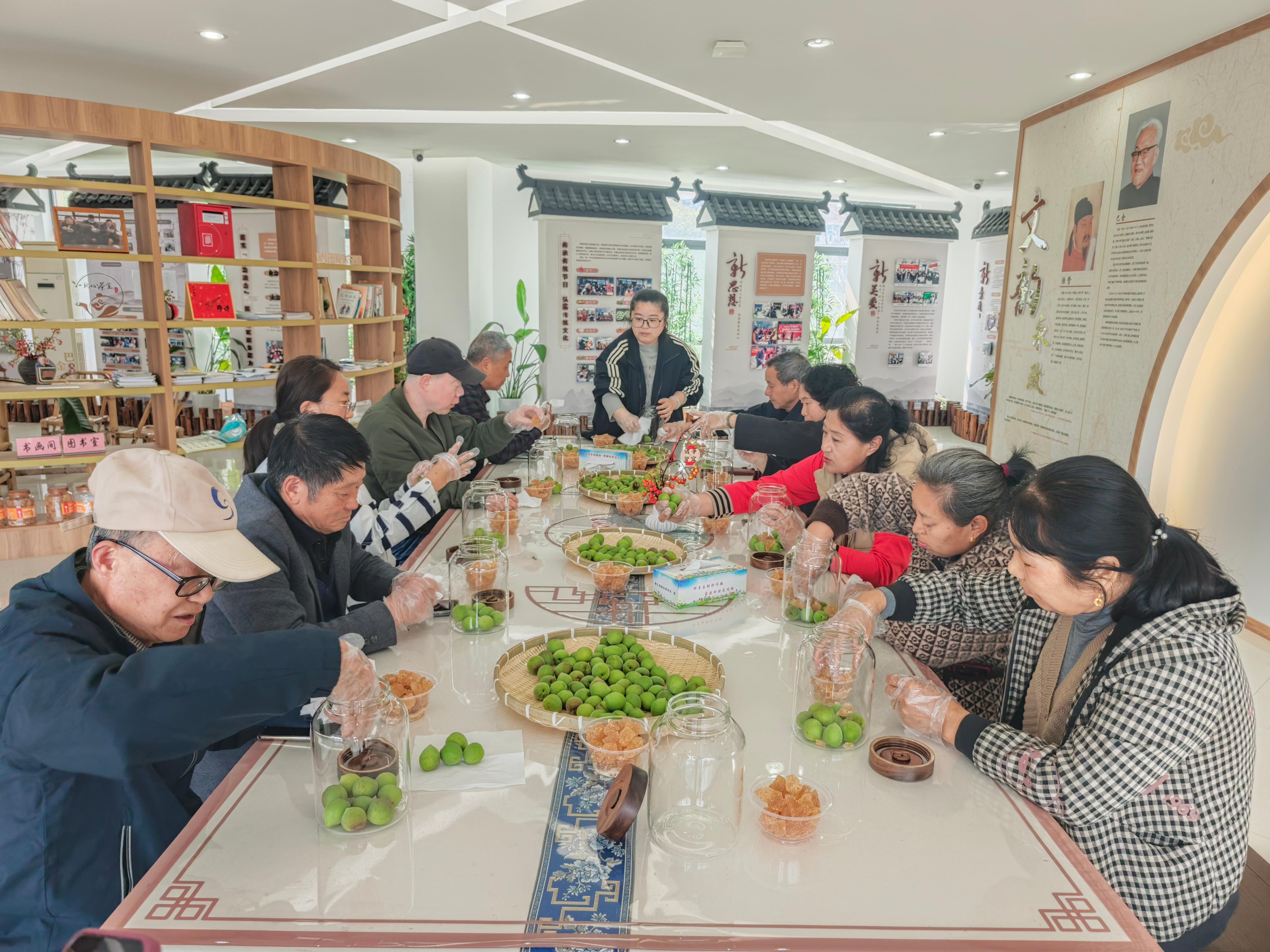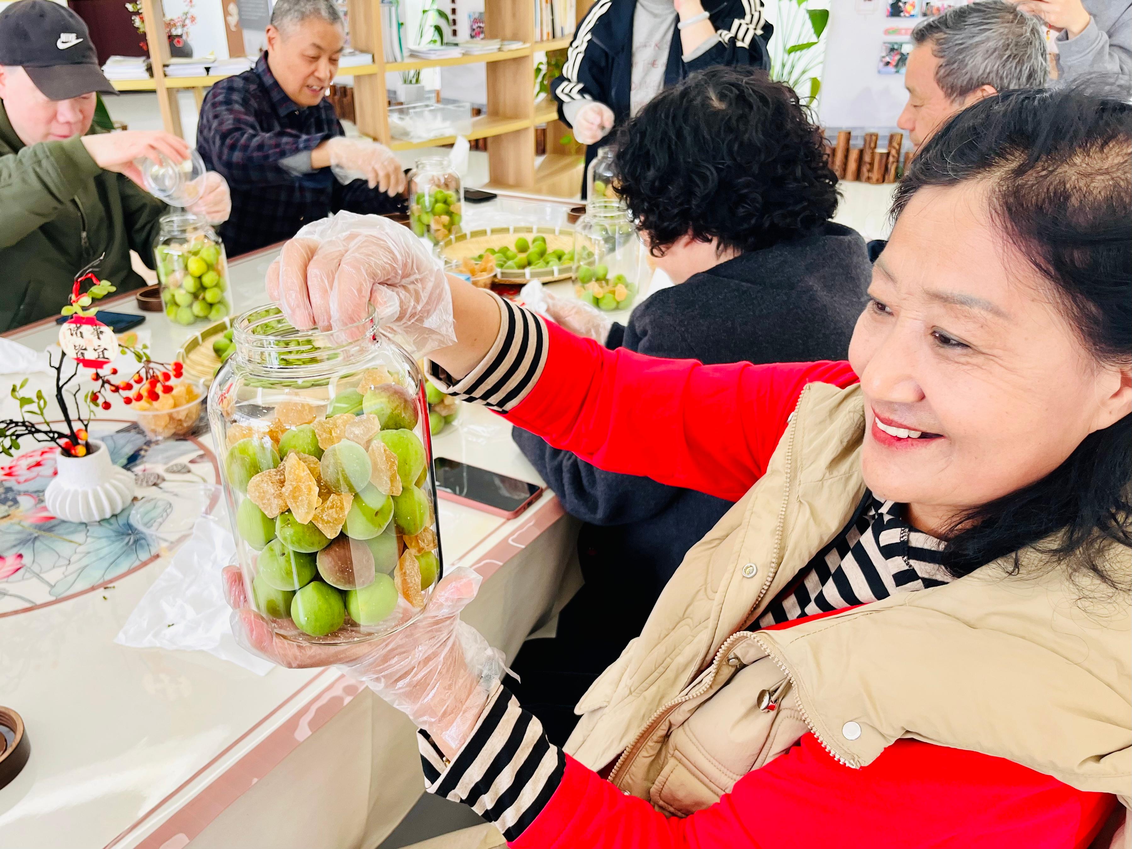 参与者们领取新鲜青梅、黄糖、玻璃罐等材料包,在指导下认真完成清洗、去蒂、晾干、码糖、封罐等工序。一粒粒青翠的梅子与晶莹的糖粒层层相叠,最后注入少许米酒,密封入罐。大家还在标签上写下祝福与签名,贴在罐身——静待时光酝酿,化为夏日里那一口清冽甘甜的清露。侨眷梁师傅笑着说:“小时候家里年年做,今天又找回那个味道了。”