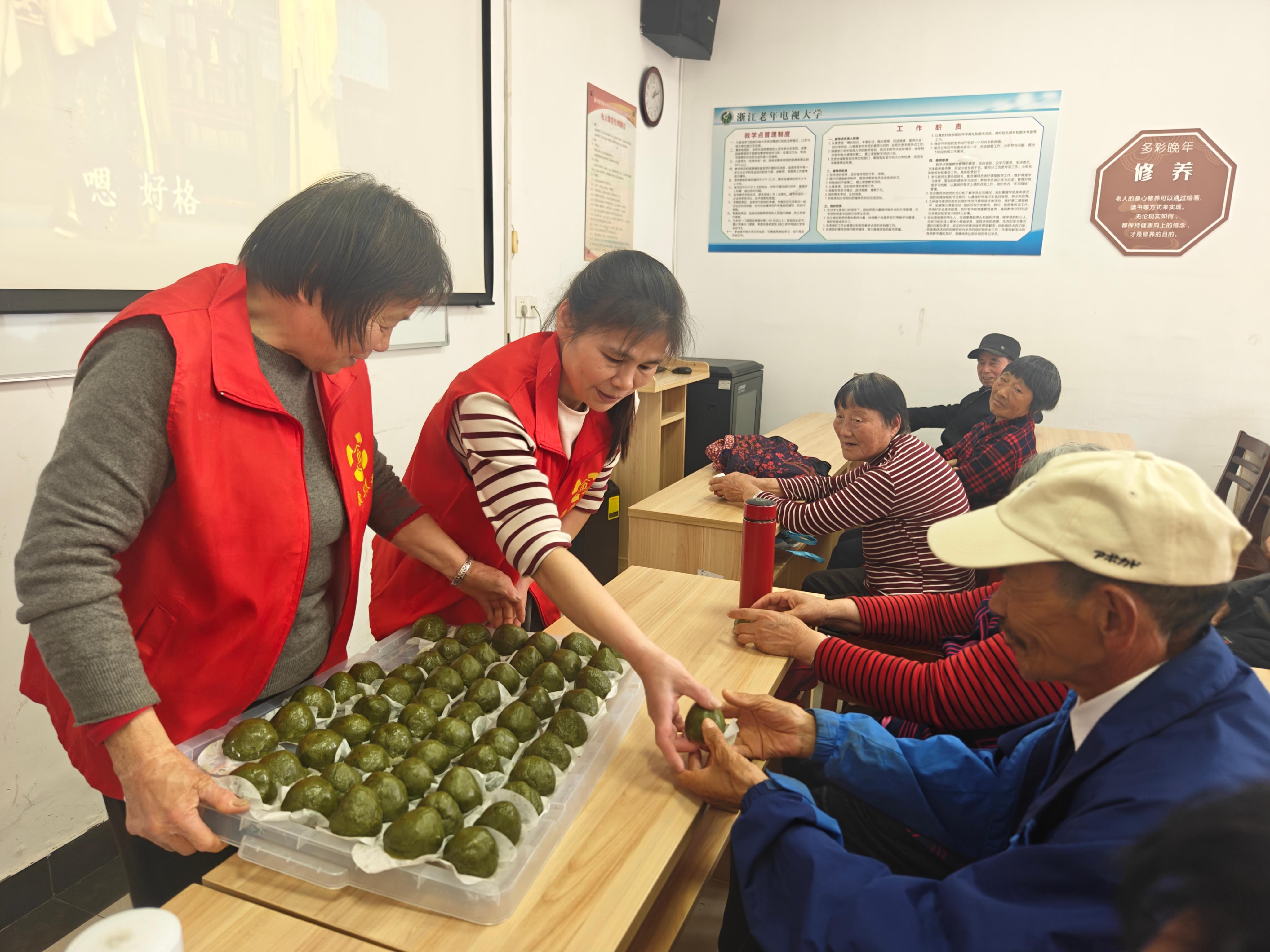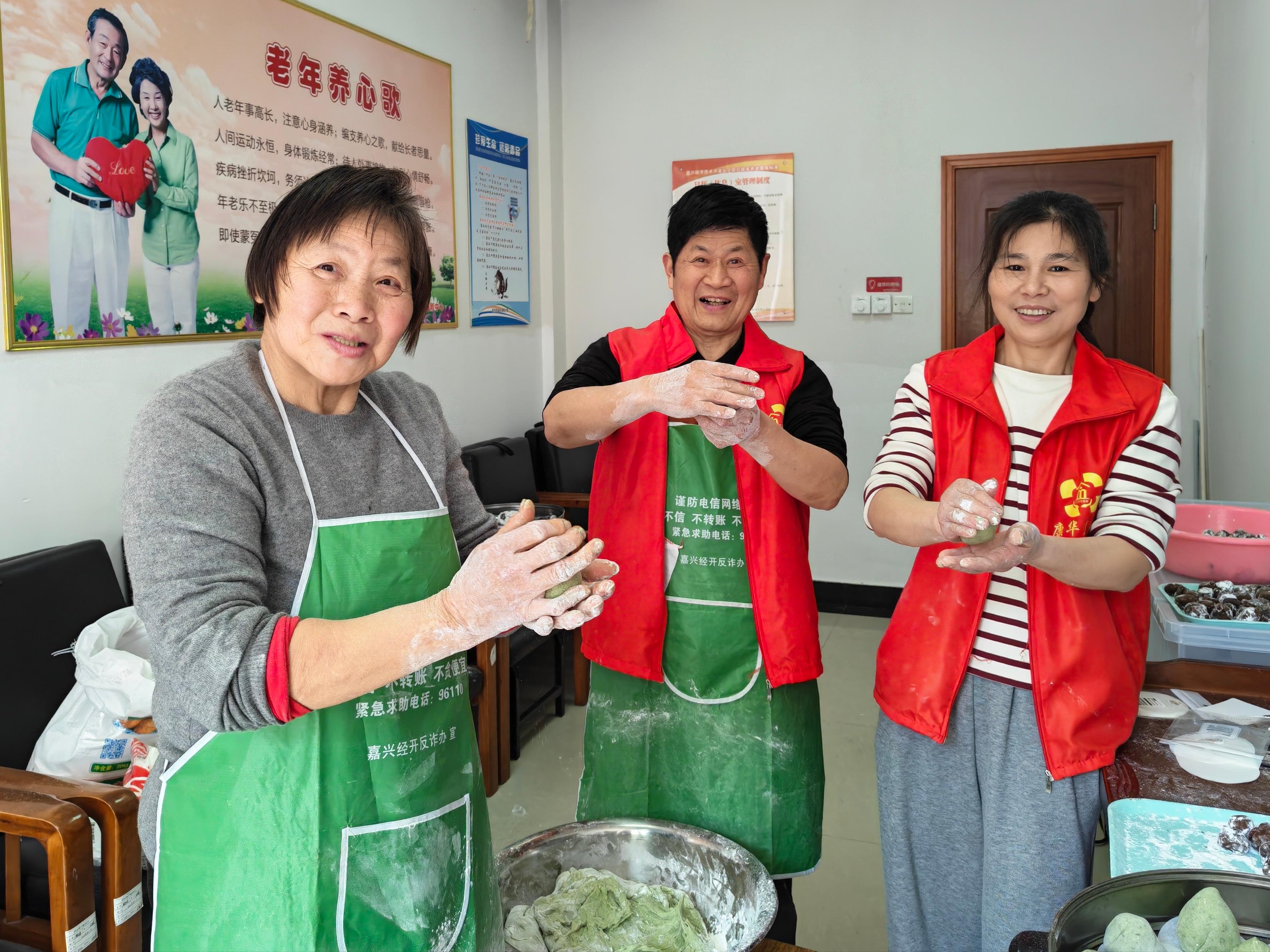 指尖揉春意,青团寄乡愁。活动现场,社区工作人员提前备好糯米粉、艾草汁、豆沙馅等材料,志愿者揉面、包馅、搓团,指尖翻飞间,一个个碧绿如玉的青团渐次成型。“以前清明都是买现成的,今天自己动手做,闻着艾草香,感觉特别有仪式感!”72岁的王奶奶捧着亲手制作的青团笑着说。社区工作人员还穿插讲解了清明食青团的习俗起源,从寒食节禁火到江南农耕文化,让老人们在动手实践中感受传统文化的深厚底蕴。